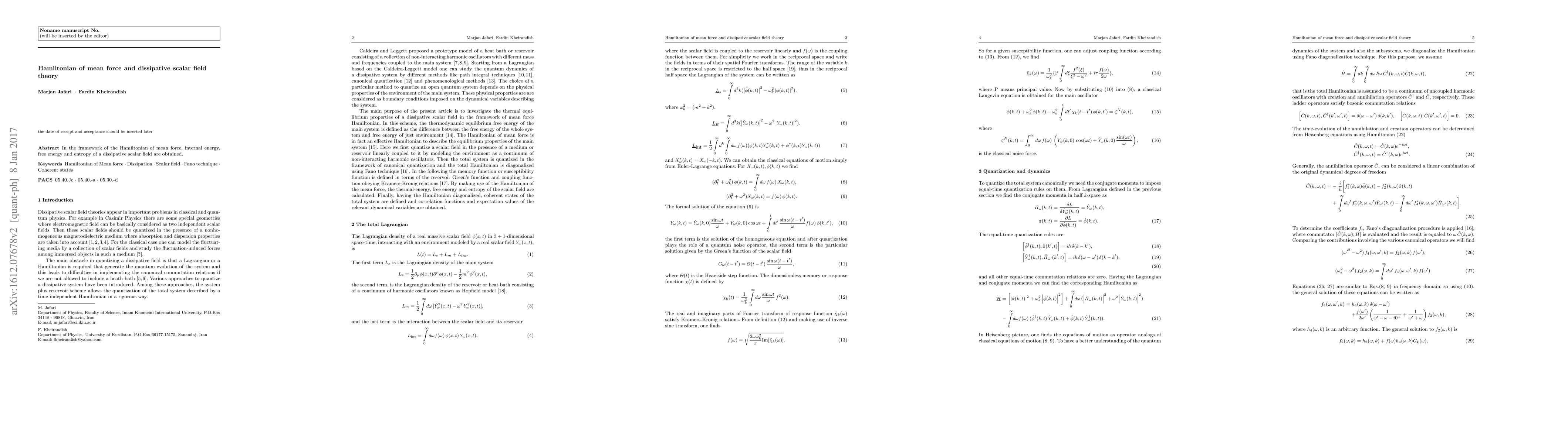 Researchers developed a theoretical framework to calculate internal energy, free energy, and entropy of a dissipative scalar field using the Hamiltonian of mean force. This work expands our understanding of complex systems by providing new insights into thermodynamic properties.