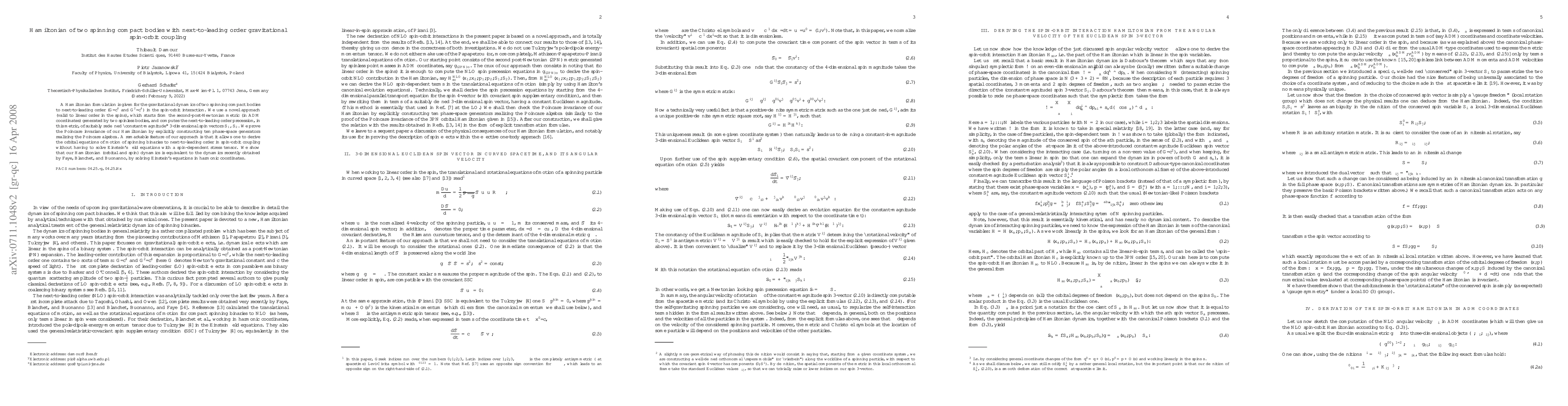 This paper presents a Hamiltonian formulation for the gravitational dynamics of two spinning compact bodies, focusing on next-to-leading order spin-orbit coupling. The authors derive the orbital equations of motion without solving Einstein's field equations, demonstrating the equivalence of their approach to results obtained through solving Einstein's equations.