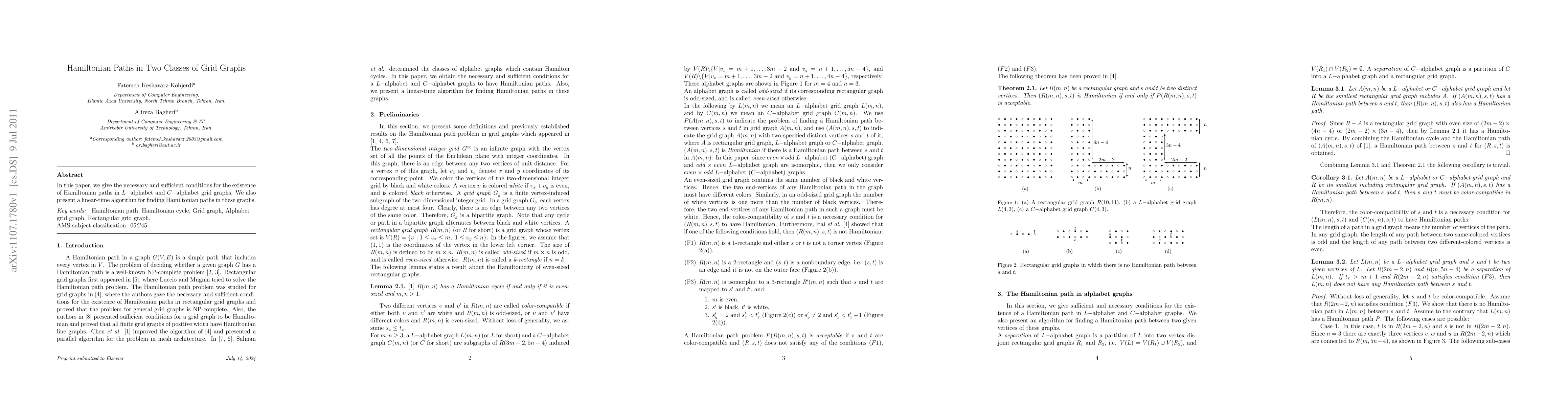 This paper provides the necessary and sufficient conditions for Hamiltonian paths in $L-$alphabet and $C-$alphabet grid graphs, along with a linear-time algorithm to find such paths.