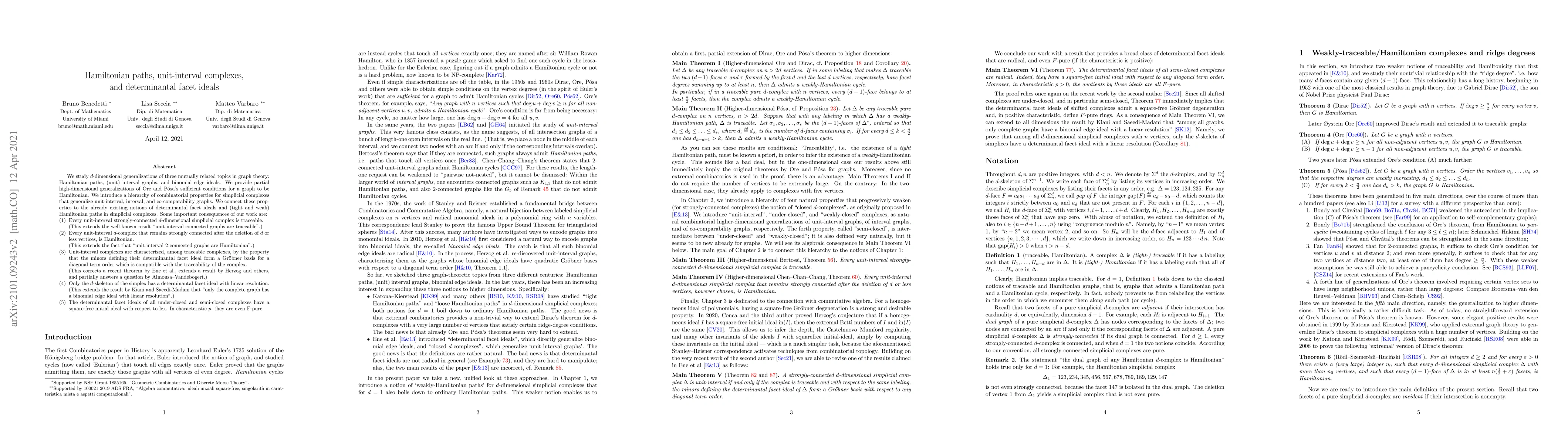 We study d-dimensional generalizations of three mutually related topics in graph theory: Hamiltonian paths, (unit) interval graphs, and binomial edge ideals. We provide partial high-dimensional generalizations of Ore and Posa's sufficient conditions for a graph to be Hamiltonian. We introduce a hierarchy of combinatorial properties for simplicial complexes that generalize unit-interval, interval, and co-comparability graphs. We connect these properties to the already existing notions of determinantal facet ideals and Hamiltonian paths in simplicial complexes. Some important consequences of our work are: (1) Every almost-closed strongly-connected d-dimensional simplicial complex is traceable. (This extends the well-known result "unit-interval connected graphs are traceable".) (2) Every almost-closed d-complex that remains strongly connected after the deletion of d or less vertices, is Hamiltonian. (This extends the fact that "unit-interval 2-connected graphs are Hamiltonian".) (3) Unit-interval complexes are characterized, among traceable complexes, by the property that the minors defining their determinantal facet ideal form a Groebner basis for a diagonal term order which is compatible with the traceability of the complex. (This corrects a recent theorem by Ene et al., extends a result by Herzog and others, and partially answers a question by Almousa-Vandebogert.) (4) Only the d-skeleton of the simplex has a determinantal facet ideal with linear resolution. (This extends the result by Kiani and Saeedi-Madani that "only the complete graph has a binomial edge ideal with linear resolution".) (5) The determinantal facet ideals of all under-closed and semi-closed complexes have a square-free initial ideal with respect to lex. In characteristic p, they are even F-pure.