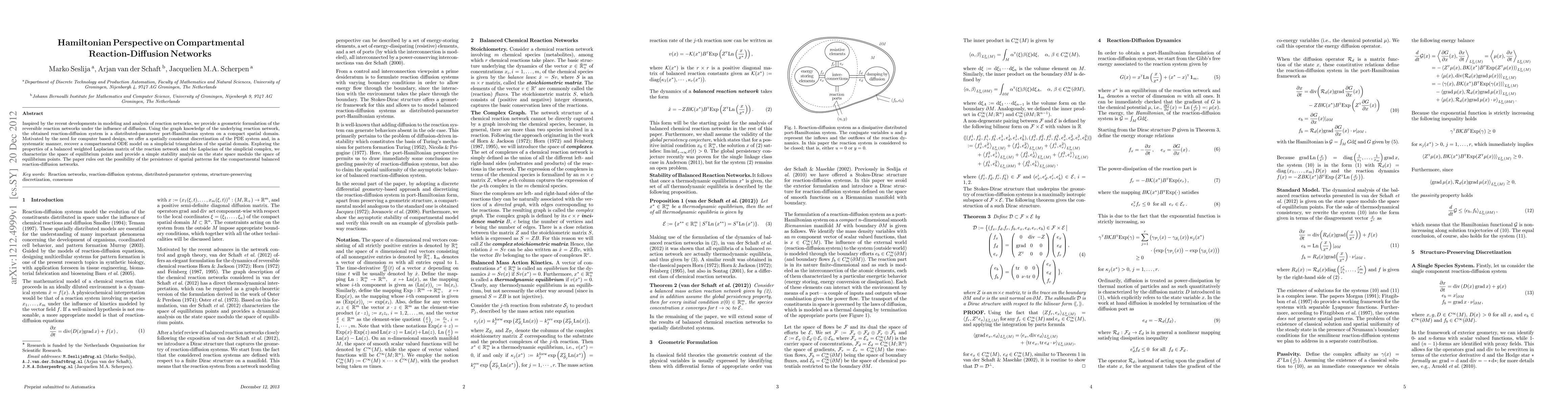 Inspired by the recent developments in modeling and analysis of reaction networks, we provide a geometric formulation of the reversible reaction networks under the influence of diffusion. Using the graph knowledge of the underlying reaction network, the obtained reaction-diffusion system is a distributed-parameter port-Hamiltonian system on a compact spatial domain. Motivated by the need for computer based design, we offer a spatially consistent discretization of the PDE system and, in a systematic manner, recover a compartmental ODE model on a simplicial triangulation of the spatial domain. Exploring the properties of a balanced weighted Laplacian matrix of the reaction network and the Laplacian of the simplicial complex, we characterize the space of equilibrium points and provide a simple stability analysis on the state space modulo the space of equilibrium points. The paper rules out the possibility of the persistence of spatial patterns for the compartmental balanced reaction-diffusion networks.