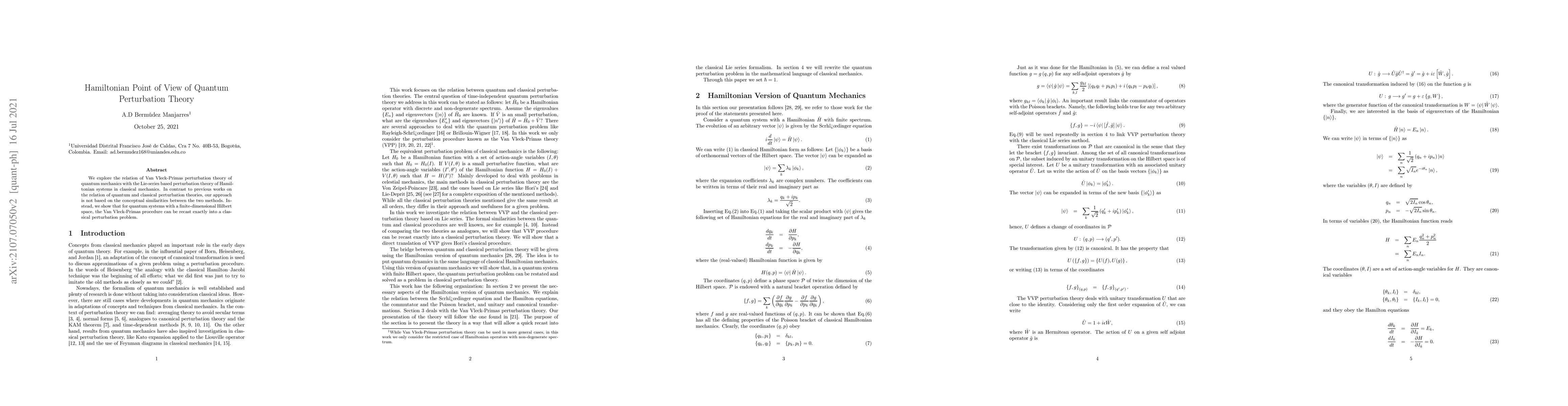 Researchers show that Van Vleck-Primas quantum perturbation theory can be exactly rewritten as a classical Hamiltonian system problem, offering a new perspective on the connection between quantum and classical mechanics.