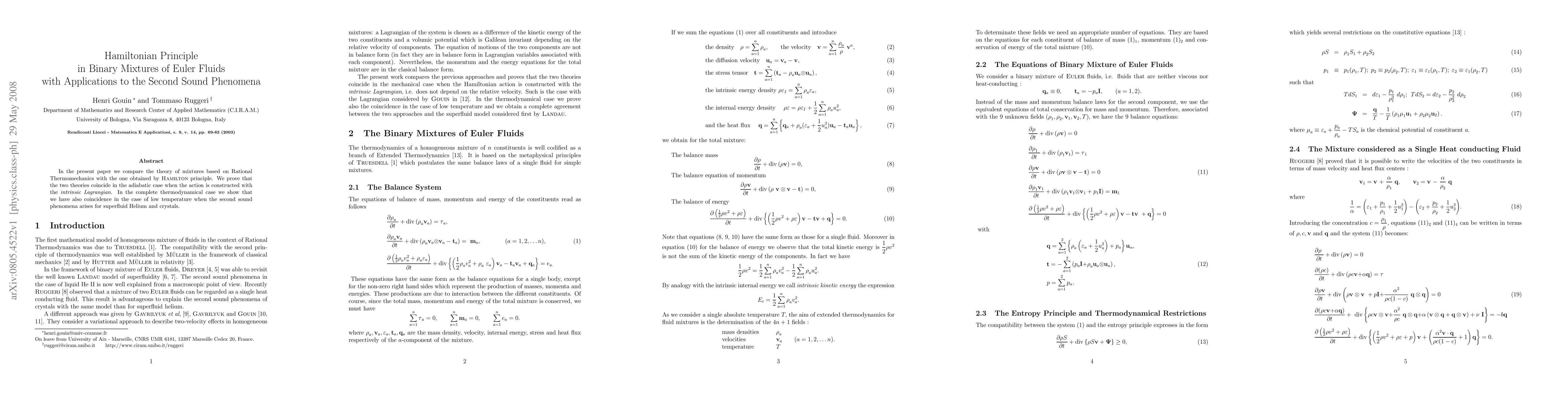 In the present paper we compare the theory of mixtures based on Rational Thermomechanics with the one obtained by Hamilton principle. We prove that the two theories coincide in the adiabatic case when the action is constructed with the intrinsic Lagrangian. In the complete thermodynamical case we show that we have also coincidence in the case of low temperature when the second sound phenomena arises for superfluid Helium and crystals.