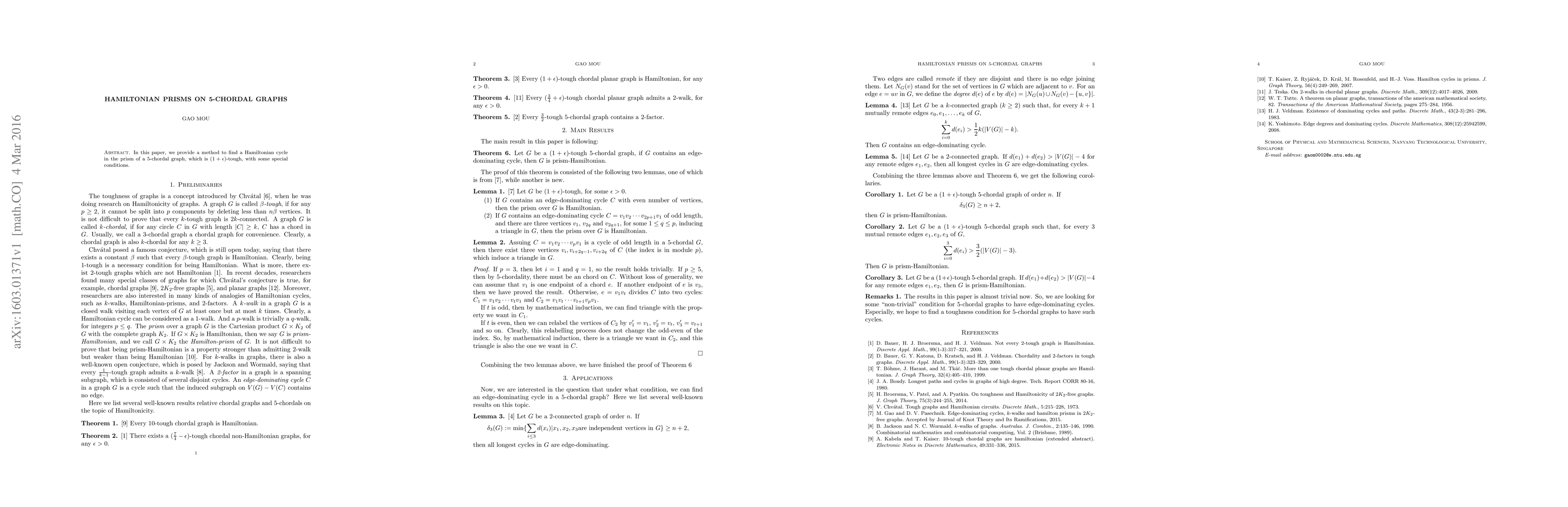 Summary: This paper presents a method to identify Hamiltonian cycles in the prism of a 5-chordal graph, demonstrating that the prism is $(1+\epsilon)$-tough under specific conditions. The approach provides a significant step towards understanding Hamiltonian structures in complex graph configurations.