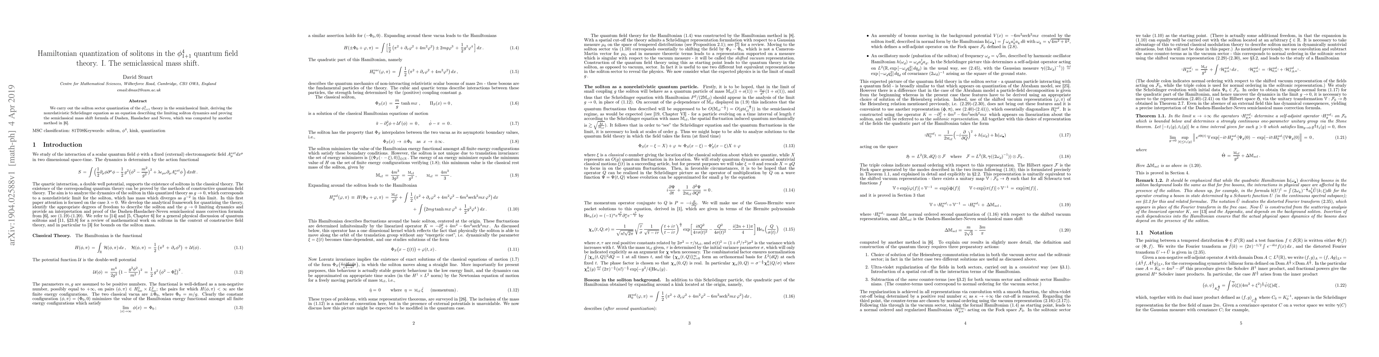 We study of the interaction of a scalar quantum field $\phi $ with a fixed (external) electromagnetic field $A^{ext}_\mu dx^\mu$ in two dimensional space-time. The dynamics is determined by the action functional \[ S\,=\,\int\,\Bigl(\frac{1}{2}\partial_\mu\phi\partial^\mu\phi- \frac{1}{2}\,g^2\bigl(\phi^2-\frac{m^2}{g^2}\bigr)^2 +\lambda\epsilon_{\mu\nu}\partial_\mu A^{ext}_\nu \phi\,\Bigr)\,dxdt\,. \] The quartic interaction, a double well potential, supports the existence of solitons in the classical theory. The existence of the corresponding quantum theory can be proved by the methods of constructive quantum field theory. The aim is to analyze the dynamics of the soliton in this quantized theory as $g\to 0 $, which corresponds to a nonrelativistic limit for the soliton, which has mass which diverges as $g^{-2} $ in this limit. In this first paper attention is focused on the case $\lambda=0$. We develop the analytical framework for quantizing the theory, identify the appropriate degrees of freedom to describe the soliton and the $g\to 0 $ limiting dynamics and provide an interpretation and proof of the Dashen-Hasslacher-Neveu semiclassical mass correction formula.