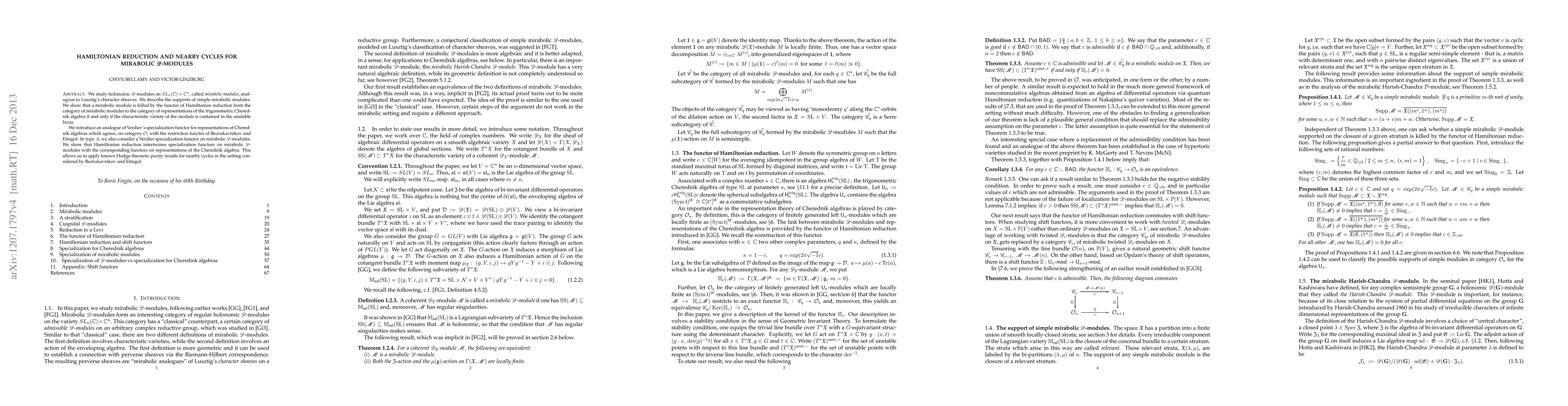 This paper investigates mirabolic D-modules on SL_n(C)xC^n, establishing connections between Hamiltonian reduction and the specialization functors for representations of the trigonometric Cherednik algebra, and applying known purity results for nearby cycles. It reveals that a mirabolic module is killed by Hamiltonian reduction if its characteristic variety lies within the unstable locus.