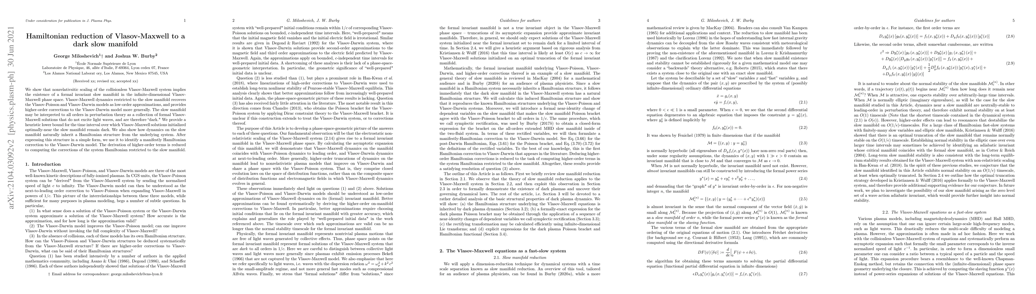 The paper shows that the Vlasov-Maxwell system has a formal invariant slow manifold, which is a set of dark solutions that do not excite light waves. The dynamics on this manifold naturally inherit a Hamiltonian structure, providing corrections to lower-order models like Vlasov-Poisson and Vlasov-Darwin.