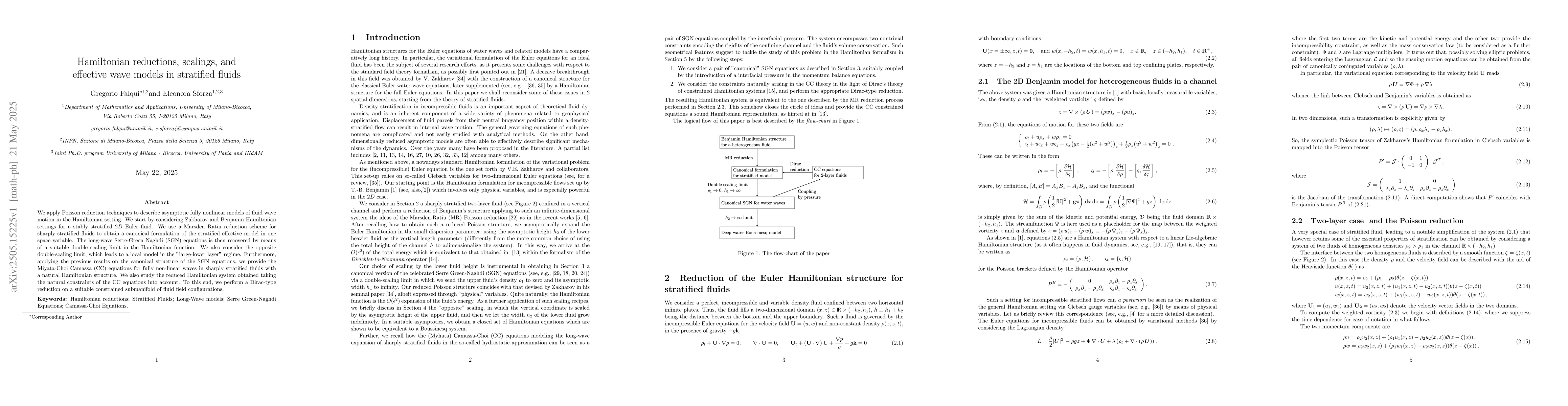 The paper presents a detailed application of Poisson reduction and Marsden-Ratiu reduction techniques to derive effective Hamiltonian models for stratified fluid wave motion, including the recovery of the SGN and CC equations.