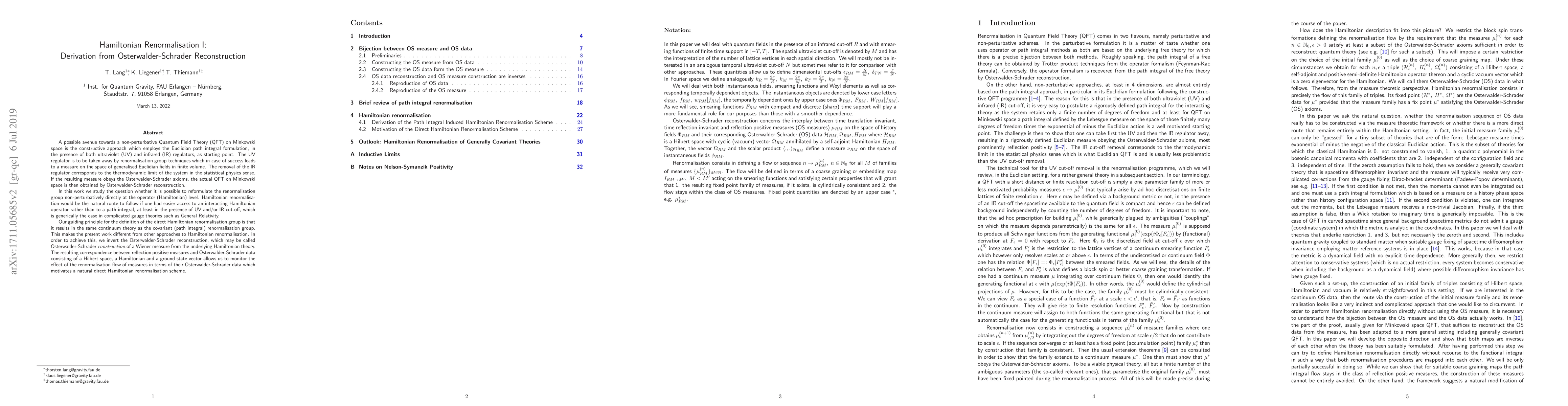 A possible avenue towards a non-perturbative Quantum Field Theory (QFT) on Minkowski space is the constructive approach which employs the Euclidian path integral formulation, in the presence of both ultraviolet (UV) and infrared (IR) regulators, as starting point. The UV regulator is to be taken away by renormalisation group techniques which in case of success leads to a measure on the space of generalised Euclidian fields in finite volume. The IR regulator corresponds to the thermodynamic limit of the system in the statistical physics sense. If the resulting measure obeys the Osterwalder-Schrader axioms, the actual QFT on Minkowski space is then obtained by Osterwalder-Schrader reconstruction. In this work we study the question whether it is possible to reformulate the renormalisation group non-perturbatively directly at the operator (Hamiltonian) level. Hamiltonian renormalisation would be the natural route to follow if one had easier access to an interacting Hamiltonian operator rather than to a path integral, at least in the presence of UV and/or IR cut-off, which is generically the case in complicated gauge theories such as General Relativity. Our guiding principle for the definition of the direct Hamiltonian renormalisation group is that it results in the same continuum theory as the covariant (path integral) renormalisation group. In order to achieve this, we invert the Osterwalder-Schrader reconstruction, which may be called Osterwalder-Schrader construction of a Wiener measure from the underlying Hamiltonian theory. The resulting correspondence between reflection positive measures and Osterwalder-Schrader data consisting of a Hilbert space, a Hamiltonian and a ground state vector allows us to monitor the effect of the renormalisation flow of measures in terms of their Osterwalder-Schrader data which motivates a natural direct Hamiltonian renormalisation scheme.