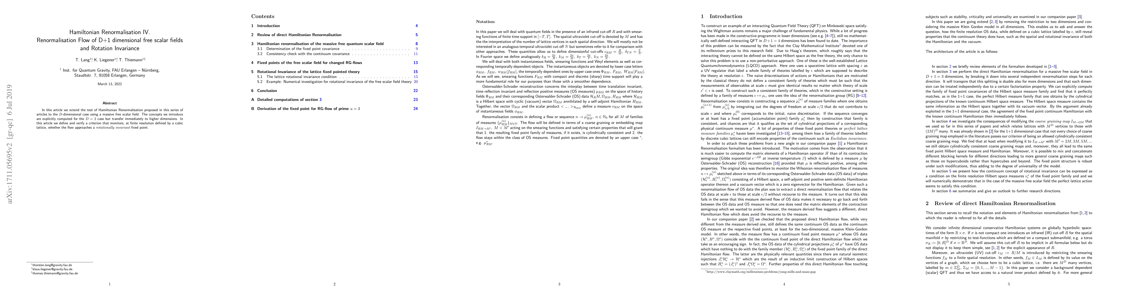 In this article we extend the test of Hamiltonian Renormalisation proposed in this series of articles to the D-dimensional case using a massive free scalar field. The concepts we introduce are explicitly computed for the D=2 case but transfer immediately to higher dimensions. In this article we define and verify a criterion that monitors, at finite resolution defined by a cubic lattice, whether the flow approaches a rotationally invariant fixed point.