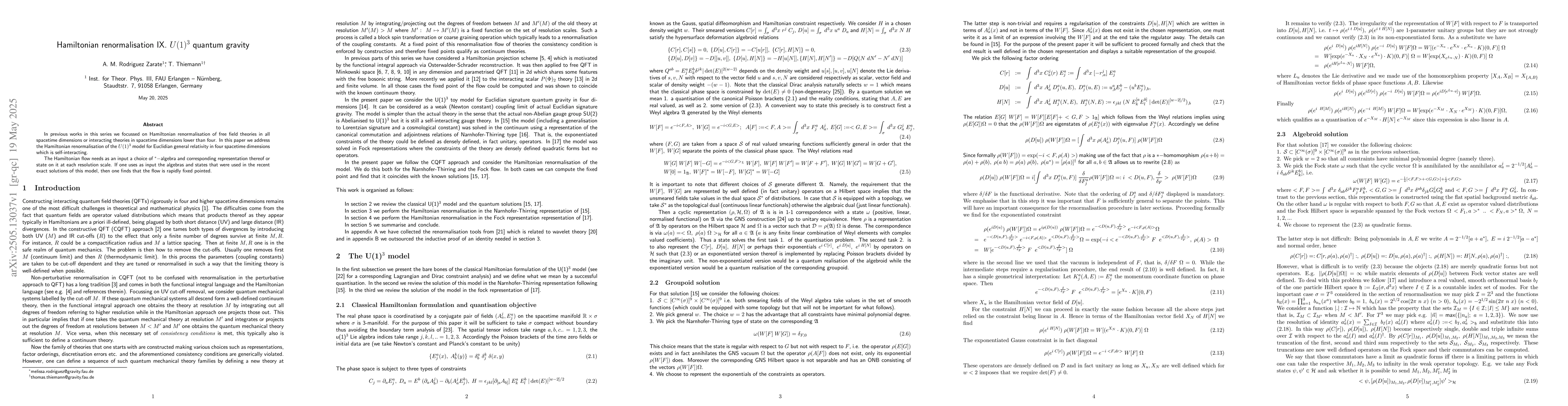 The research employs Hamiltonian renormalisation techniques, focusing on self-interacting U(1)**3 model for Euclidean general relativity in four spacetime dimensions. It uses specific *-algebras, representations, and states as inputs for the Hamiltonian flow at each resolution scale.