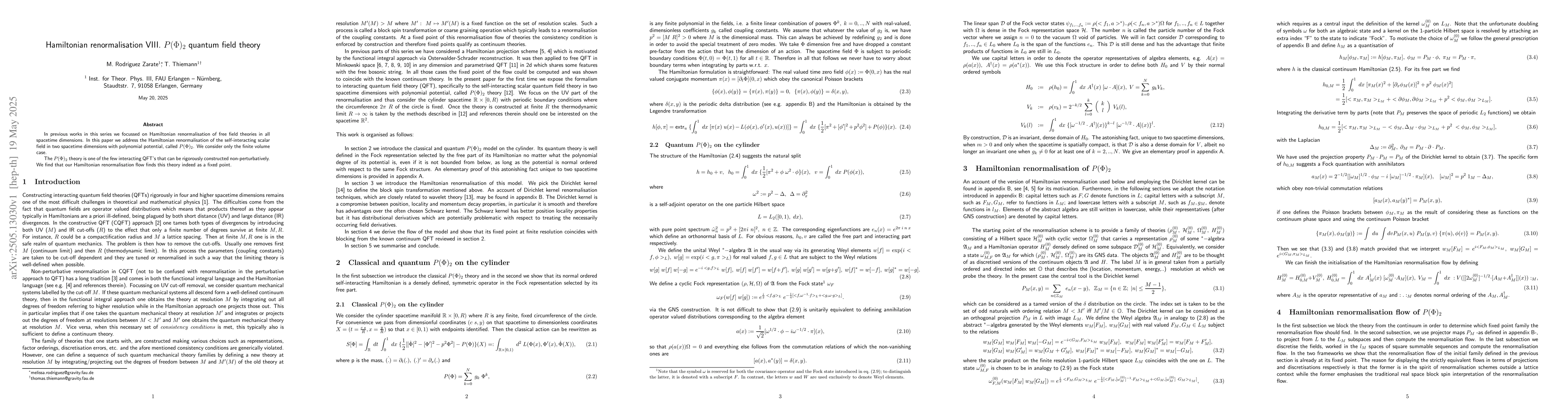 The research employs Hamiltonian renormalisation techniques to study self-interacting scalar fields in two-dimensional spacetime with polynomial potential (P(Phi,2)) in finite volume.