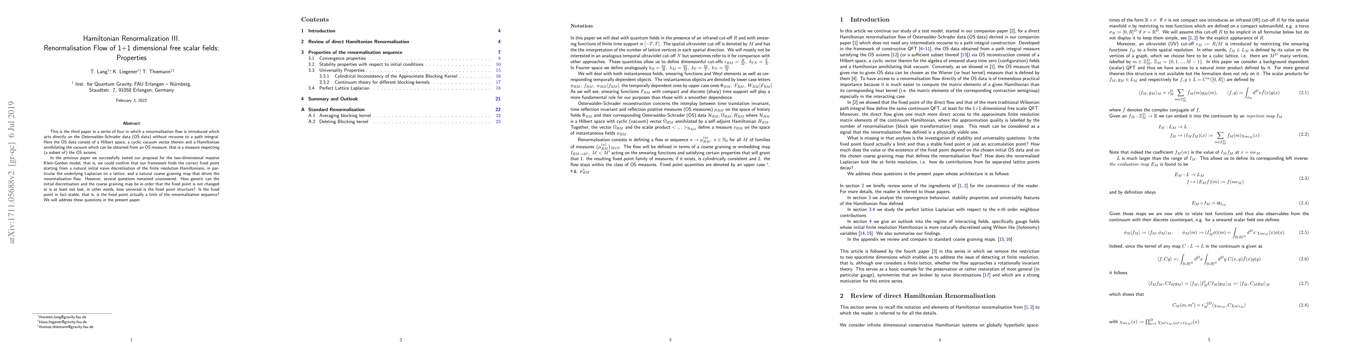 This is the third paper in a series of four in which a renormalisation flow is introduced which acts directly on the Osterwalder-Schrader data (OS data) without recourse to a path integral. Here the OS data consist of a Hilbert space, a cyclic vacuum vector therein and a Hamiltonian annihilating the vacuum which can be obtained from an OS measure, that is a measure respecting (a subset of) the OS axioms. In the previous paper we successfully tested our proposal for the two-dimensional massive Klein-Gordon model, that is, we could confirm that our framework finds the correct fixed point starting from a natural initial naive discretisation of the finite resolution Hamiltonians, in particular the underlying Laplacian on a lattice, and a natural coarse graining map that drives the renormalisation flow. However, several questions remained unanswered. How generic can the initial discretisation and the coarse graining map be in order that the fixed point is not changed or is at least not lost, in other words, how universal is the fixed point structure? Is the fix point in fact stable, that is, is the fixed point actually a limit of the renormalisation sequence? We will address these questions in the present paper.