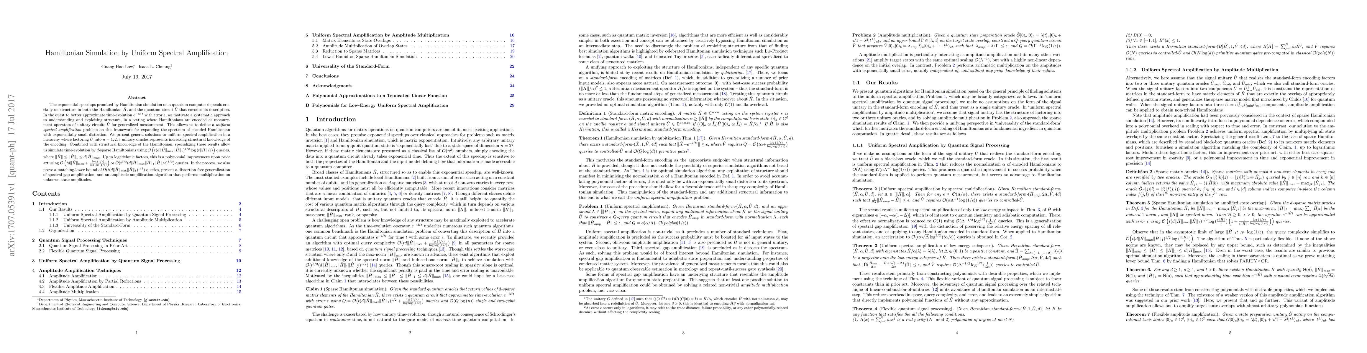 This paper proposes a systematic approach to Hamiltonian simulation on quantum computers, leveraging uniform spectral amplification to achieve exponential speedups. It presents solutions for simulating time-evolution by $d$-sparse Hamiltonians with significantly fewer queries, achieving a polynomial improvement over prior methods.
