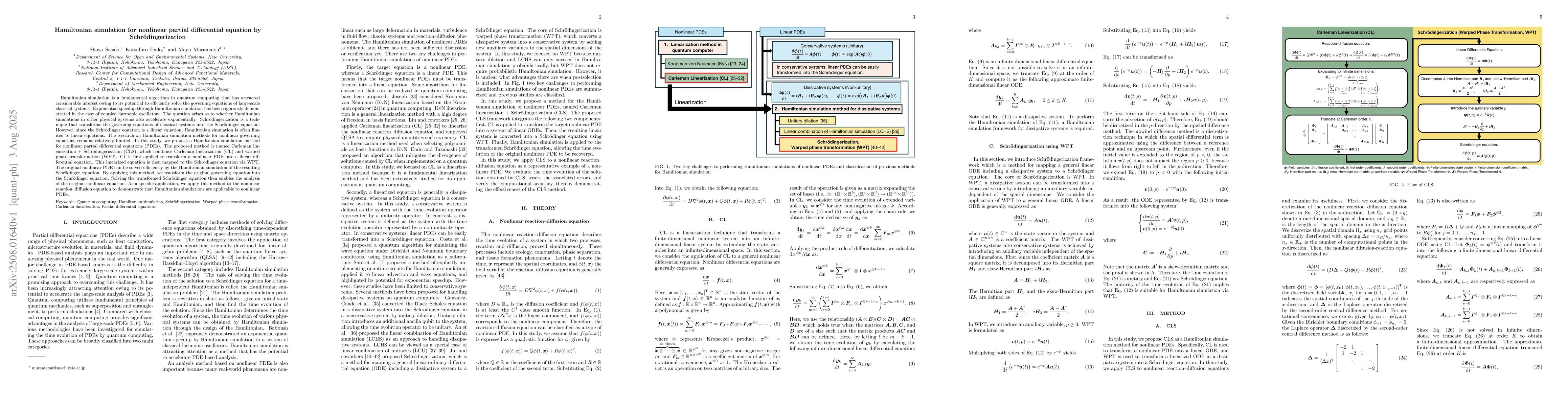 Hamiltonian simulation is a fundamental algorithm in quantum computing that has attracted considerable interest owing to its potential to efficiently solve the governing equations of large-scale classical systems. Exponential speedup through Hamiltonian simulation has been rigorously demonstrated in the case of coupled harmonic oscillators. The question arises as to whether Hamiltonian simulations in other physical systems also accelerate exponentially. Schr\"odingerization is a technique that transforms the governing equations of classical systems into the Schr\"odinger equation. However, since the Schr\"odinger equation is a linear equation, Hamiltonian simulation is often limited to linear equations. The research on Hamiltonian simulation methods for nonlinear governing equations remains relatively limited. In this study, we propose a Hamiltonian simulation method for nonlinear partial differential equations (PDEs). The proposed method is named Carleman linearization + Schr\"odingerization (CLS), which combines Carleman linearization (CL) and warped phase transformation (WPT). CL is first applied to transform a nonlinear PDE into a linear differential equation. This linearized equation is then mapped to the Schr\"odinger equation via WPT. The original nonlinear PDE can be solved efficiently by the Hamiltonian simulation of the resulting Schr\"odinger equation. By applying this method, we transform the original governing equation into the Schr\"odinger equation. Solving the transformed Schr\"odinger equation then enables the analysis of the original nonlinear equation. As a specific application, we apply this method to the nonlinear reaction--diffusion equation to demonstrate that Hamiltonian simulations are applicable to nonlinear PDEs.