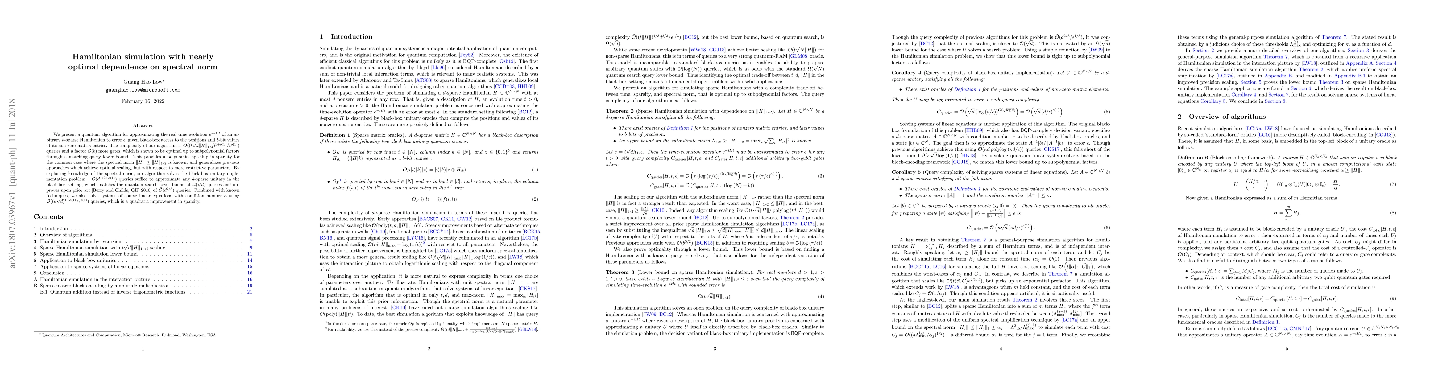 This paper introduces a quantum algorithm for simulating the time evolution of $d$-sparse Hamiltonians with nearly optimal complexity, achieving $\mathcal{O}((t\sqrt{d}\|H\|_{1 \rightarrow 2})^{1+o(1)}/\epsilon^{o(1)})$ queries. It optimally exploits the spectral norm for polynomial speedup in sparsity and improves upon previous methods for black-box unitary implementation.