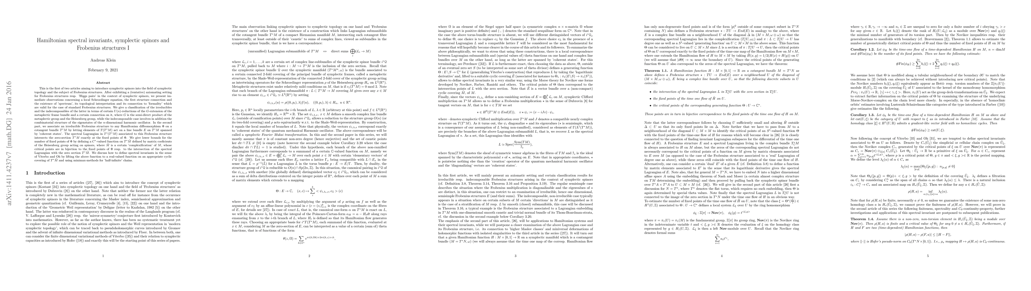 This paper introduces symplectic spinors and Frobenius structures into symplectic topology, classifying irreducible and indecomposable structures via $U(n)$-reductions. It associates an irreducible Frobenius structure to Hamiltonian diffeomorphisms on cotangent bundles, defining spectral invariants through a $C^*$-valued function on a complexified manifold and using minimax-methods.