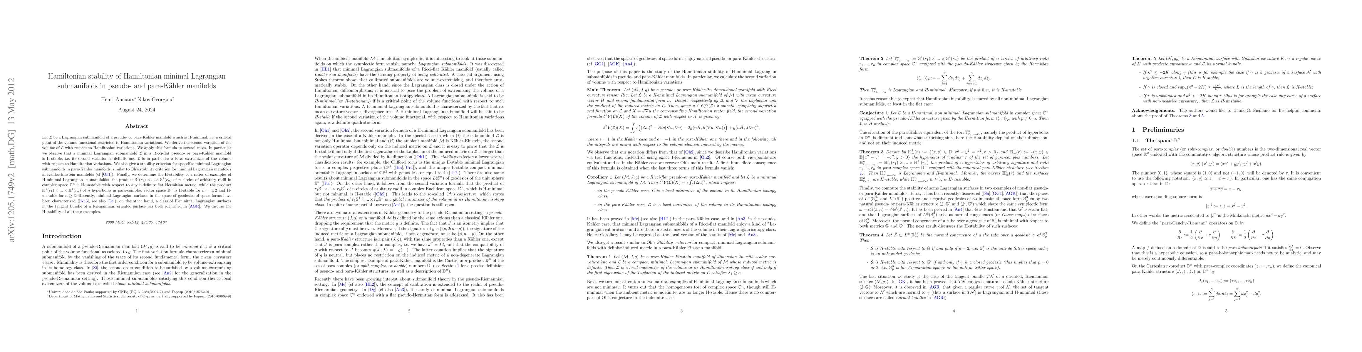 Let L be a Lagrangian submanifold of a pseudo- or para-K\"ahler manifold which is H-minimal, i.e. a critical point of the volume functional restricted to Hamiltonian variations. We derive the second variation of the volume of L with respect to Hamiltonian variations. We apply this formula to several cases. In particular we observe that a minimal Lagrangian submanifold L in a Ricci-flat pseudo- or para-K\"ahler manifold is H-stable, i.e. its second variation is definite and L therefore a local extremizer of the volume with respect to Hamiltonian variations. We also give a stability criterion for spacelike minimal Lagrangian submanifolds in para-K\"ahler manifolds, similar to Oh's stability criterion for minimal Lagrangian manifolds in K\"ahler-Einstein manifolds. Finally, we determine the H-stability of a series of examples of H-minimal Lagrangian submanifolds: the product of n circles of arbitrary radii in complex space C^n is H-unstable with respect to any indefinite flat Hermitian metric, while the product of n hyperbolas in para-complex vector space D^n is H-stable for n=1,2 and H-unstable for n > 2. Recently, minimal Lagrangian surfaces in the space of geodesics of three-dimensional space forms have been characterized; on the other hand, a class of H-minimal Lagrangian surfaces in the tangent bundle of a Riemannian, oriented surface has been identified. We discuss the H-stability of all these examples.