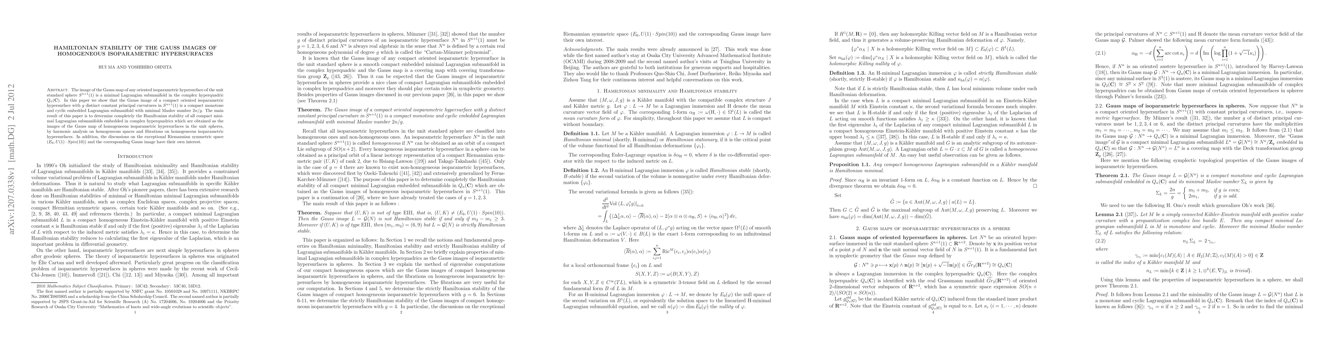This paper explores the Hamiltonian stability of Gauss images of homogeneous isoparametric hypersurfaces in unit spheres, demonstrating they are compact, cyclic, and monotone Lagrangian submanifolds with minimal Maslov number. The main achievement is a complete determination of the Hamiltonian stability of these submanifolds using harmonic analysis on homogeneous spaces.