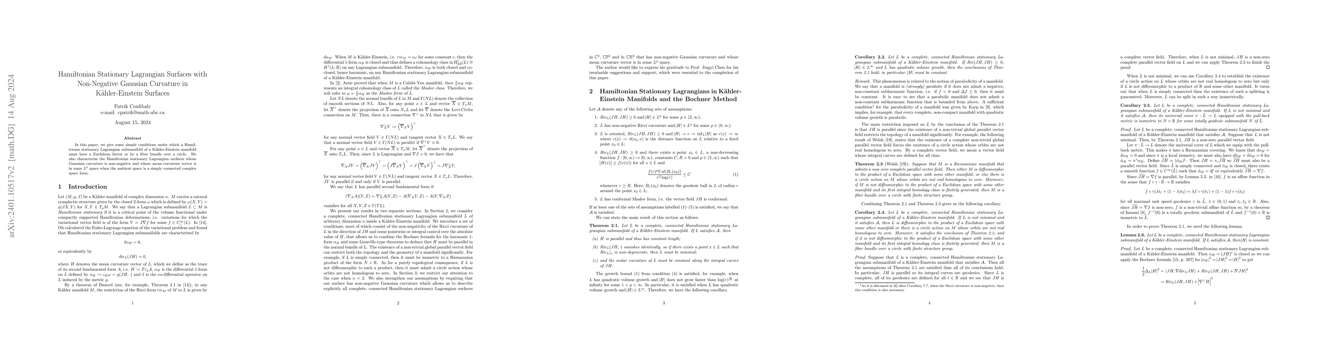 Summary: This paper provides conditions for Hamiltonian stationary Lagrangian submanifolds in Kähler-Einstein manifolds to either have a Euclidean factor or be a fiber bundle over a circle. It also characterizes Lagrangian surfaces with non-negative Gaussian curvature and mean curvature in $L^p$ space in simply connected complex space forms.