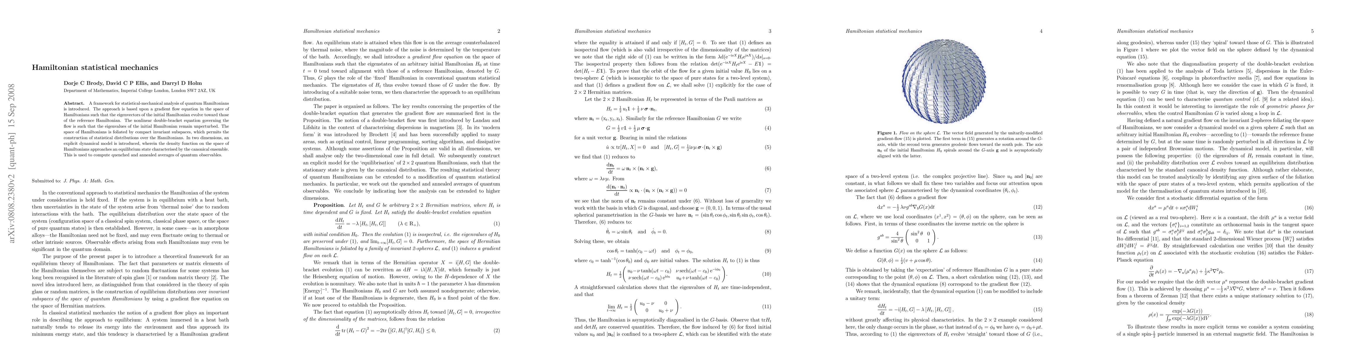 A framework for statistical-mechanical analysis of quantum Hamiltonians is introduced. The approach is based upon a gradient flow equation in the space of Hamiltonians such that the eigenvectors of the initial Hamiltonian evolve toward those of the reference Hamiltonian. The nonlinear double-bracket equation governing the flow is such that the eigenvalues of the initial Hamiltonian remain unperturbed. The space of Hamiltonians is foliated by compact invariant subspaces, which permits the construction of statistical distributions over the Hamiltonians. In two dimensions, an explicit dynamical model is introduced, wherein the density function on the space of Hamiltonians approaches an equilibrium state characterised by the canonical ensemble. This is used to compute quenched and annealed averages of quantum observables.