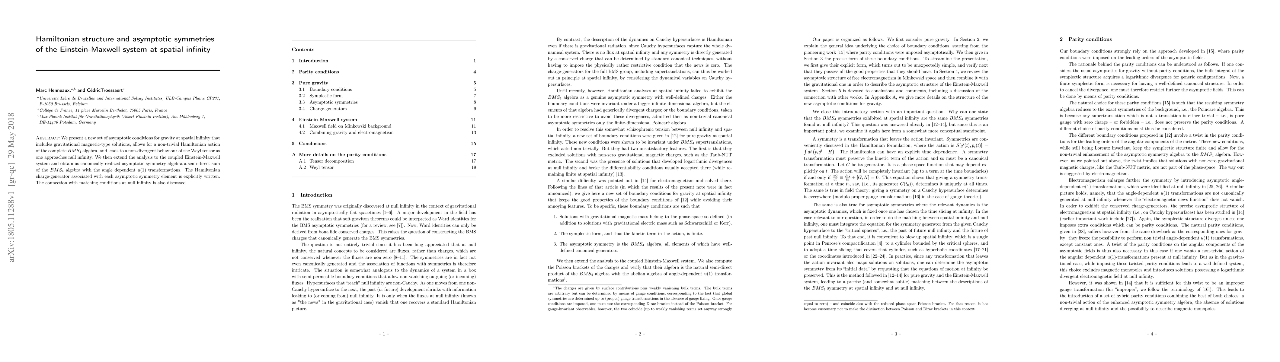 We present a new set of asymptotic conditions for gravity at spatial infinity that includes gravitational magnetic-type solutions, allows for a non-trivial Hamiltonian action of the complete $BMS_4$ algebra, and leads to a non-divergent behaviour of the Weyl tensor as one approaches null infinity. We then extend the analysis to the coupled Einstein-Maxwell system and obtain as canonically realized asymptotic symmetry algebra a semi-direct sum of the $BMS_4$ algebra with the angle dependent $u(1)$ transformations. The Hamiltonian charge-generator associated with each asymptotic symmetry element is explicitly written. The connection with matching conditions at null infinity is also discussed.