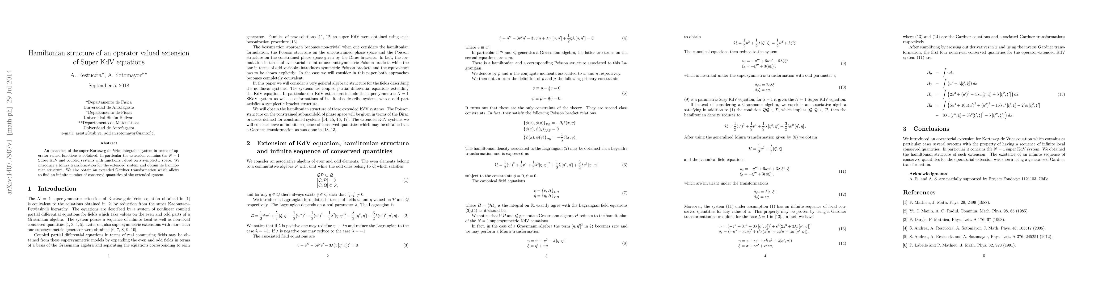 An extension of the super Korteweg-de Vries integrable system in terms of operator valued functions is obtained. In particular the extension contains the $N=1$ Super KdV and coupled systems with functions valued on a symplectic space. We introduce a Miura transformation for the extended system and obtain its hamiltonian structure. We also obtain an extended Gardner transformation which allows to find an infinite number of conserved quantities of the extended system.