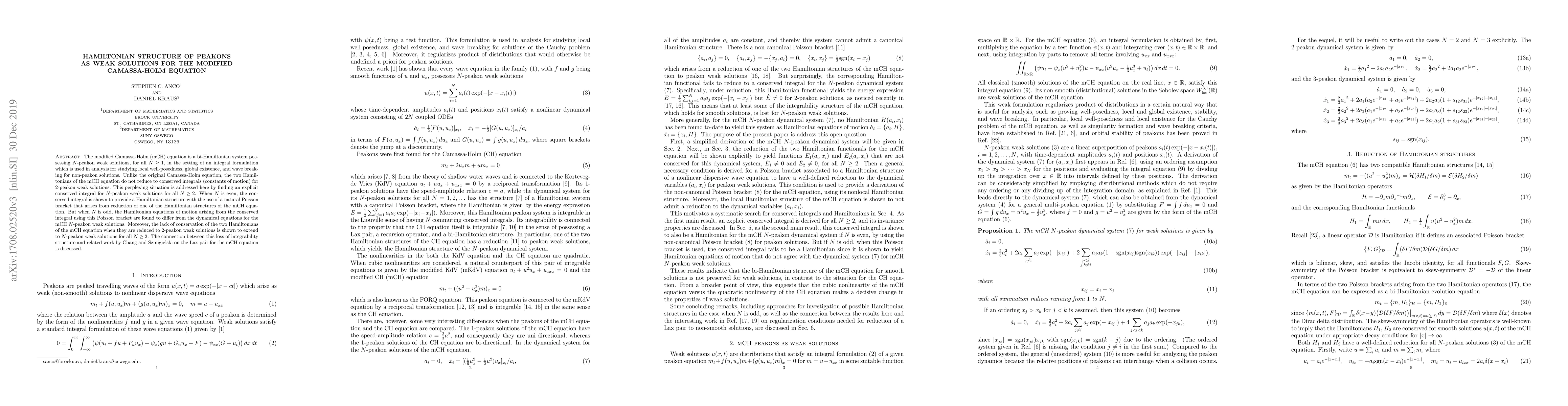 This paper investigates the Hamiltonian structure of $N$-peakon weak solutions for the modified Camassa-Holm equation, revealing a conserved integral for $N\geq 2$. It finds that while even $N$ allows for a Hamiltonian structure via a natural Poisson bracket, odd $N$ results in differing dynamical equations, highlighting the loss of integrability for all $N\geq 2$.