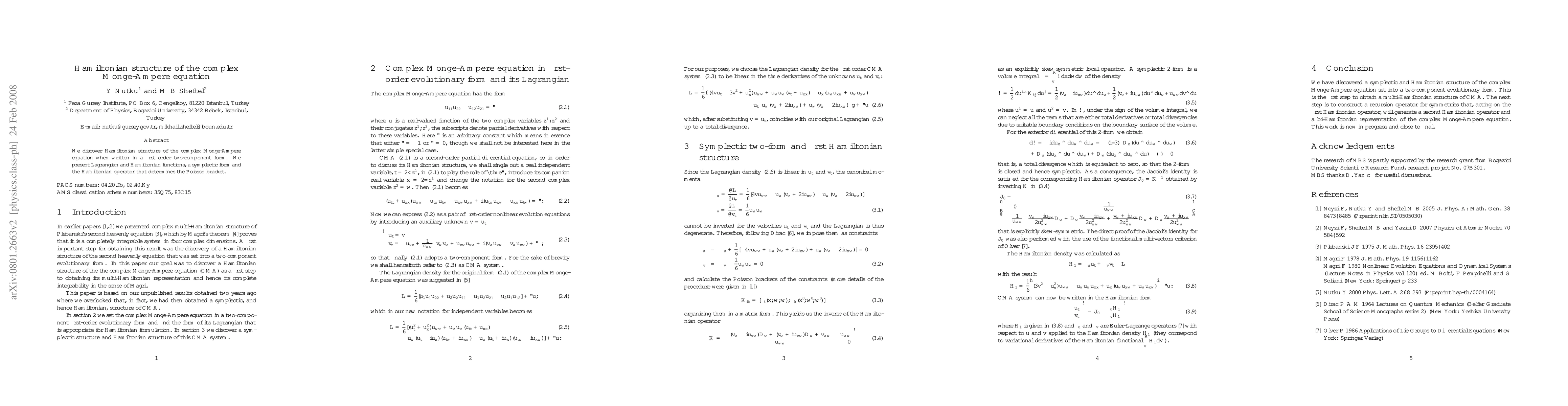 The paper presents a symplectic two-form, a Hamiltonian operator, and constraints derived from a degenerate Lagrangian density, establishing a Hamiltonian structure for the complex Monge-Ampère equation in first-order form.