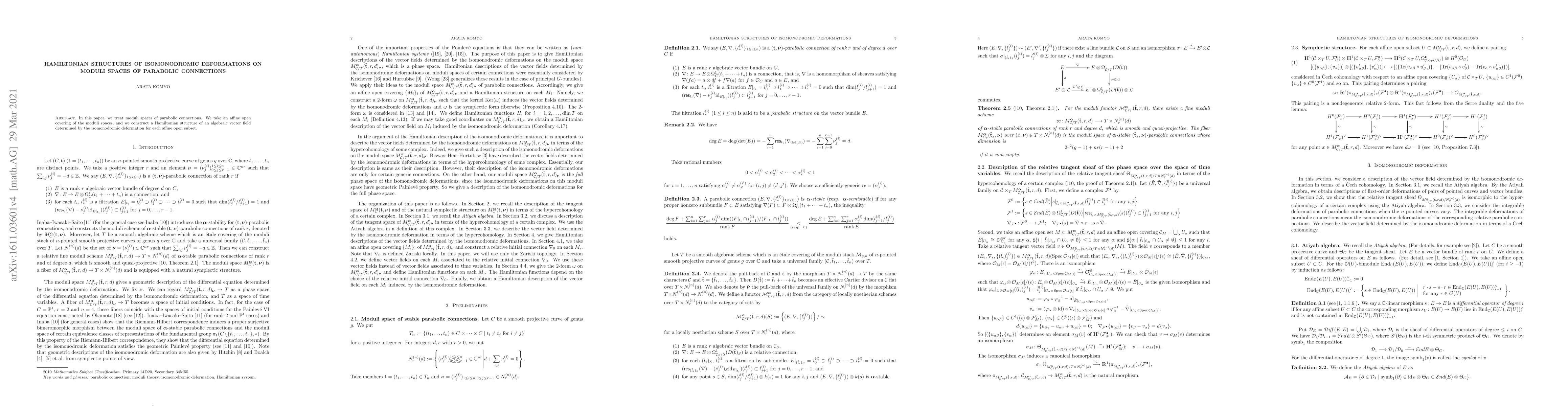 This paper examines moduli spaces of parabolic connections and constructs a Hamiltonian structure for algebraic vector fields associated with isomonodromic deformations through étale coverings of these moduli spaces.