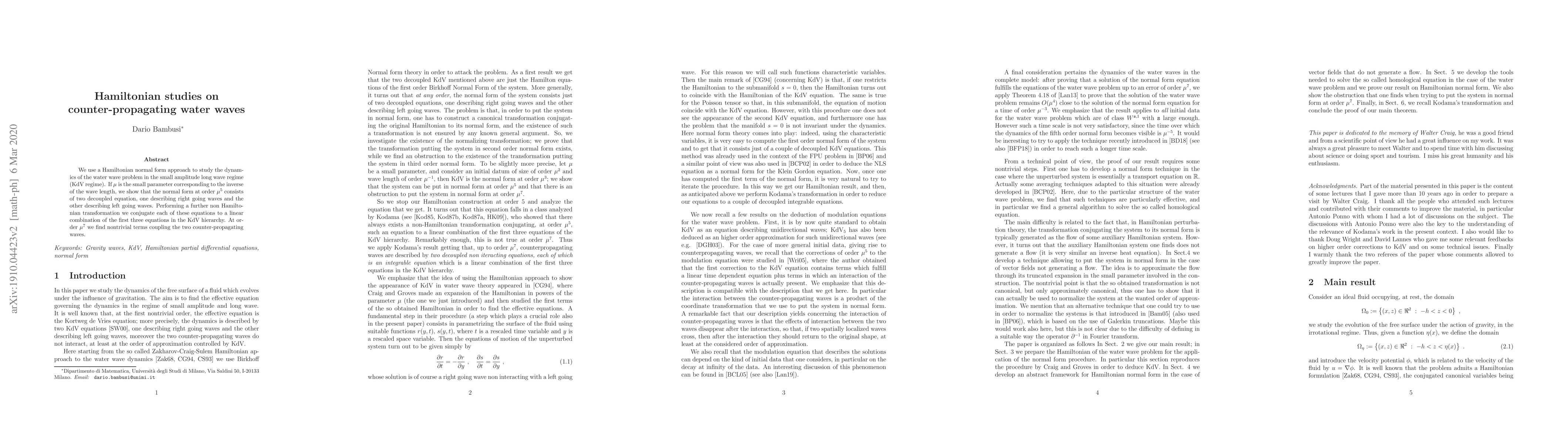 We use a Hamiltonian normal form approach to study the dynamics of the water wave problem in the small amplitude long wave regime (KdV regime). If $\mu$ is the small parameter corresponding to the inverse of the wave length, we show that the normal form at order $\mu^5$ consists of two decoupled equation, one describing right going waves and the other describing left going waves. Performing a further non Hamiltonian transformation we conjugate each of these equations to a linear combination of the first three equations in the KdV hierarchy. At order $\mu^7$ we find nontrivial terms coupling the two counter-propagating waves.