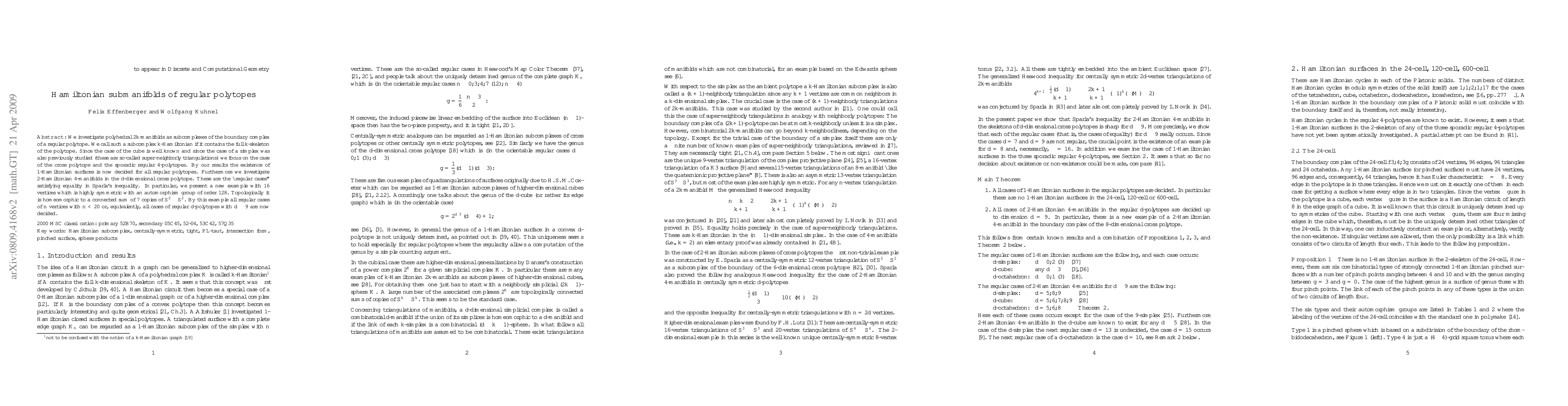 This paper explores Hamiltonian submanifolds within the boundary complexes of regular polytopes, specifically focusing on 1-Hamiltonian surfaces and 2-Hamiltonian 4-manifolds. It resolves the existence of 1-Hamiltonian surfaces for all regular polytopes and presents a highly symmetric example of a 2-Hamiltonian 4-manifold in the cross polytope, concluding the regular cases for polytopes with fewer than 20 vertices.