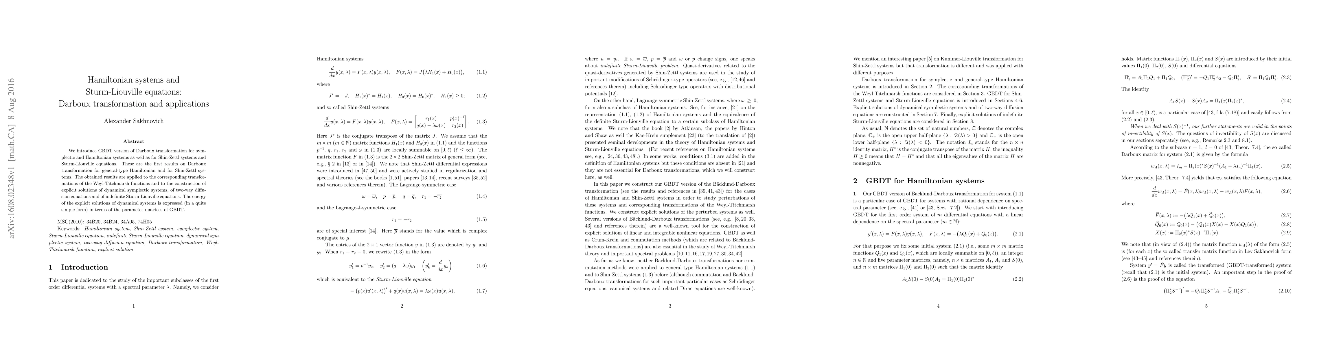 This paper introduces a GBDT version of Darboux transformation for Hamiltonian and Shin-Zettl systems, along with Sturm-Liouville equations. It applies these transformations to construct explicit solutions for dynamical systems and diffusion equations, expressing their energy in terms of parameter matrices.