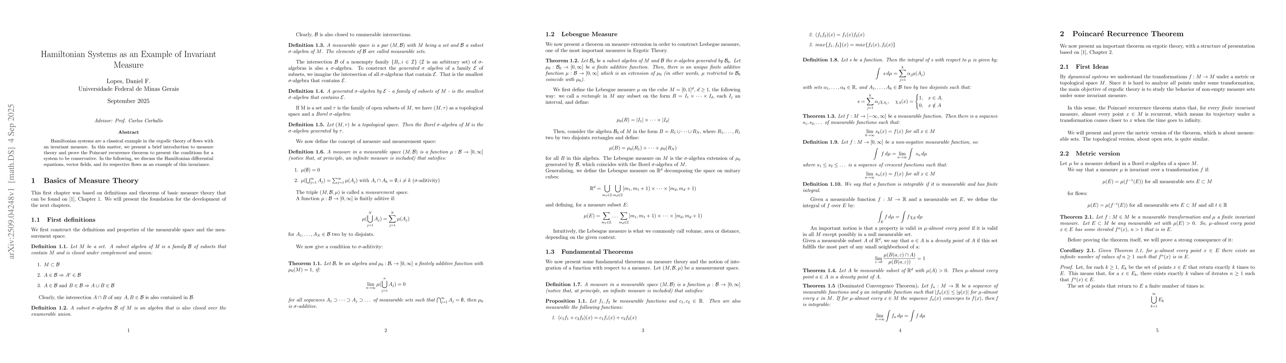 Hamiltonian systems are a classical example in the ergodic theory of flows with an invariant measure. In this matter, we present a brief introduction to measure theory and prove the Poincare recurrence theorem to present the conditions for a system to be conservative. In the following, we discuss the Hamiltonian differential equations, vector fields, and its respective flows as an example of this invariance.