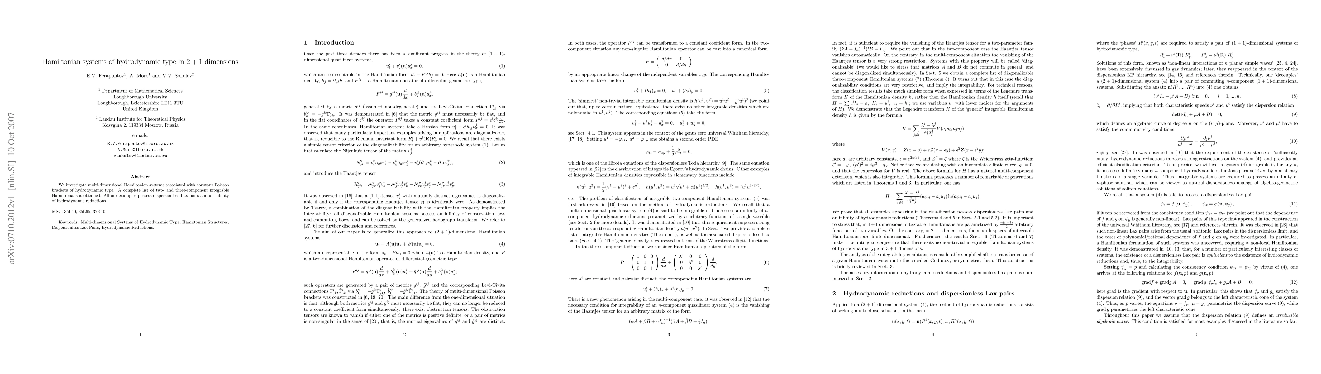 This paper explores Hamiltonian systems in 2+1 dimensions with hydrodynamic-type constant Poisson brackets, identifying integrable two- and three-component Hamiltonians characterized by dispersionless Lax pairs and numerous hydrodynamic reductions.