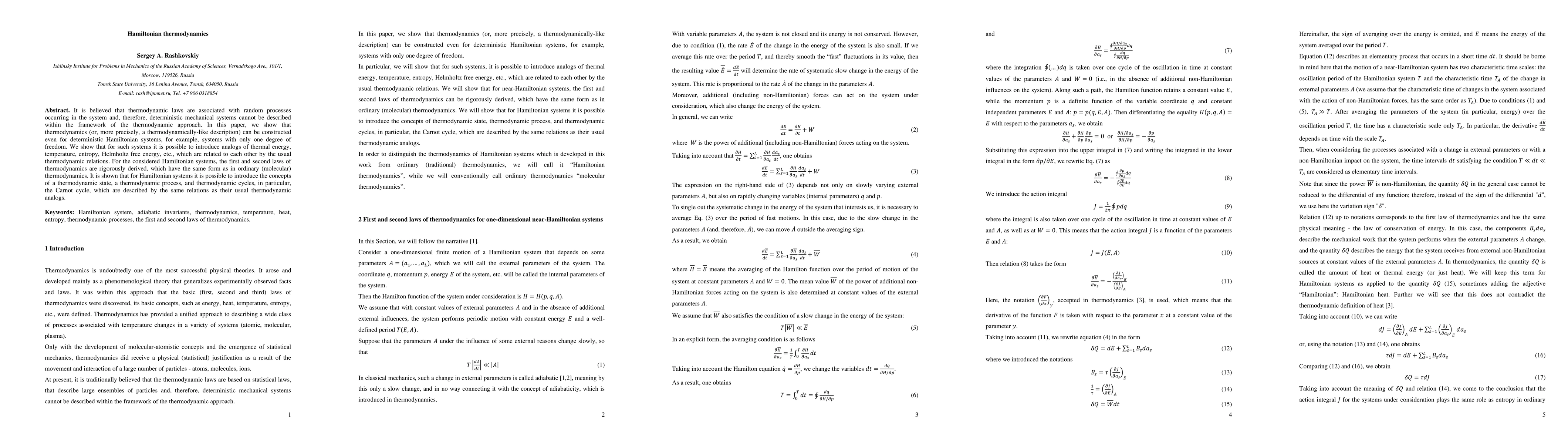 This paper demonstrates that thermodynamic principles can be applied to deterministic Hamiltonian systems, introducing concepts like thermal energy, temperature, and entropy, and rigorously deriving the first and second laws of thermodynamics in the same form as in molecular thermodynamics. It extends thermodynamic state, process, and cycles to these systems, including the Carnot cycle.