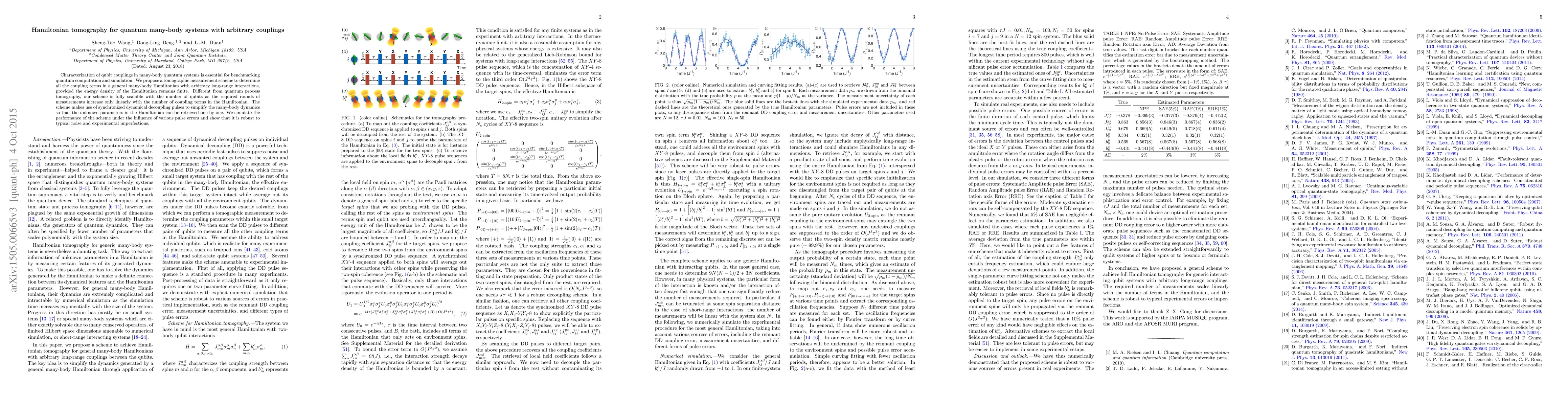 This paper proposes a scalable tomographic measurement scheme for characterizing qubit couplings in quantum many-body systems, utilizing synchronized dynamical decoupling pulses to retrieve Hamiltonian parameters efficiently. The method is robust against noise and experimental errors, making it practical for real-world quantum computation and simulation.