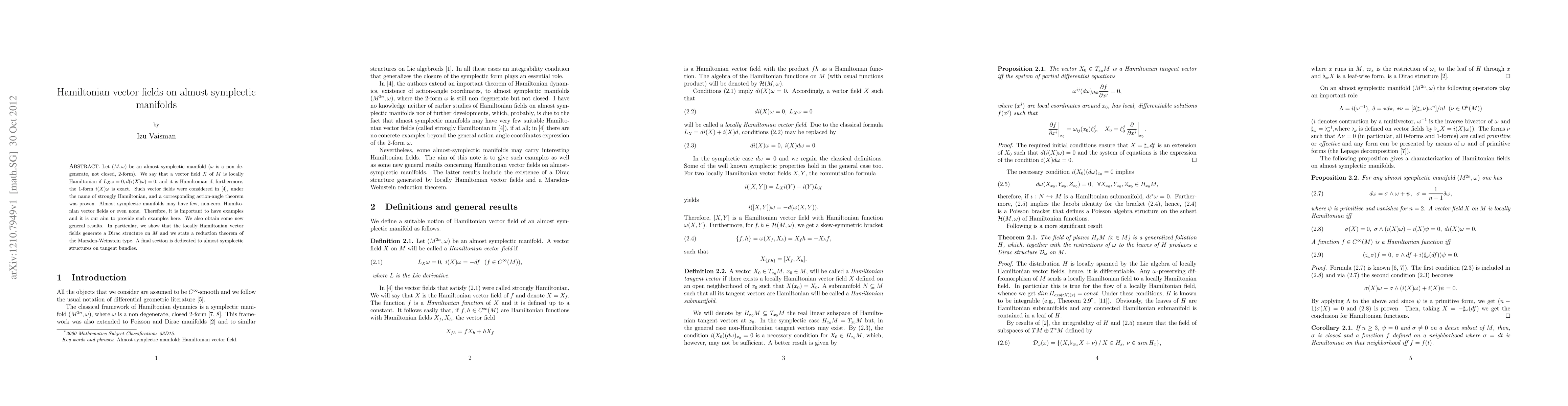This paper explores Hamiltonian vector fields on almost symplectic manifolds, providing examples of such fields and proving that they generate a Dirac structure. It also establishes a reduction theorem akin to the Marsden-Weinstein type and examines almost symplectic structures on tangent bundles.