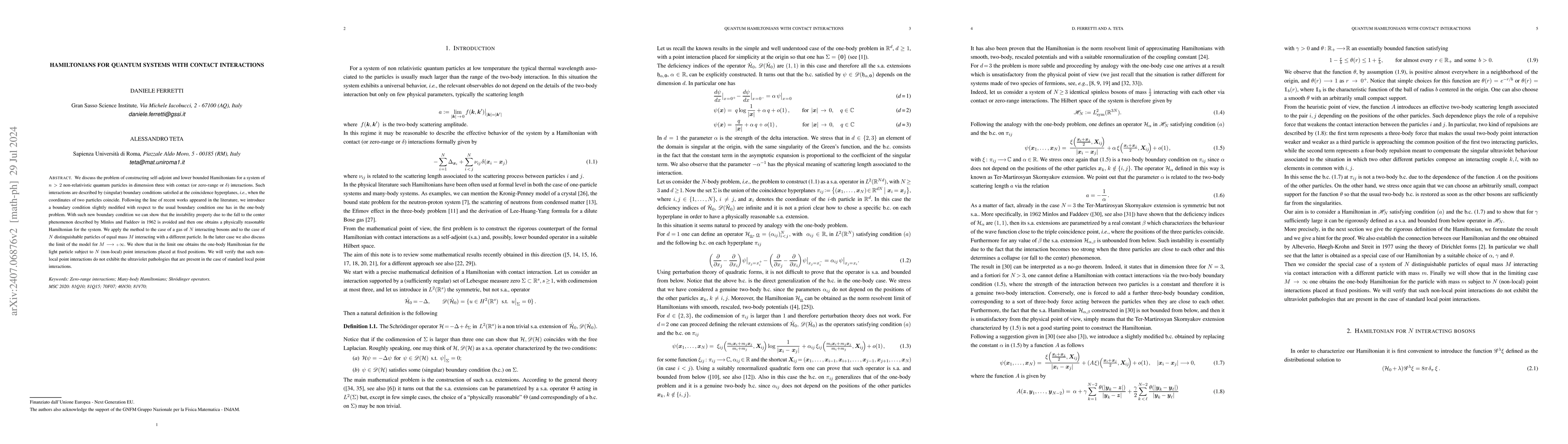 This paper constructs self-adjoint, lower bounded Hamiltonians for quantum systems of non-relativistic particles with contact interactions, avoiding the instability due to the "fall to the center" phenomenon. It introduces a modified boundary condition that leads to a physically reasonable Hamiltonian, applied to bosons and distinguishable particles, and discusses the limit for heavy particles to obtain a one-body Hamiltonian with non-local point interactions free from ultraviolet pathologies.