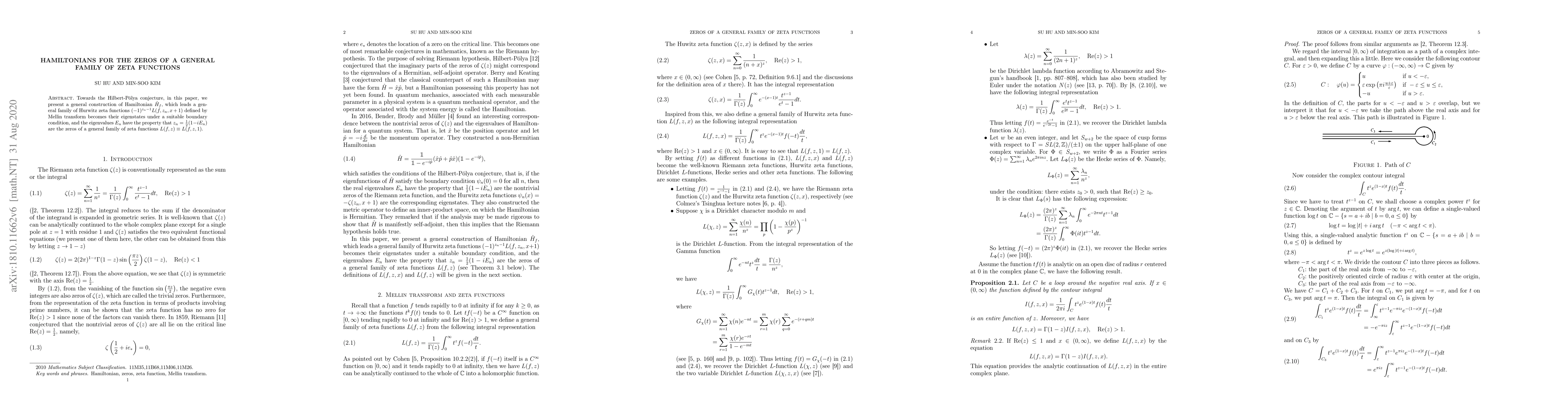 Towards the Hilbert-P\'olya conjecture, in this paper, we present a general construction of Hamiltonian $\hat{H}_{f},$ which leads a general family of Hurwitz zeta functions $(-1)^{z_{n}-1}L(f,z_{n},x+1)$ defined by Mellin transform becomes their eigenstates under a suitable boundary condition, and the eigenvalues $E_{n}$ have the property that $z_{n}=\frac{1}{2}(1-iE_{n})$ are the zeros of a general family of zeta functions $L(f,z)\equiv L(f,z,1)$.