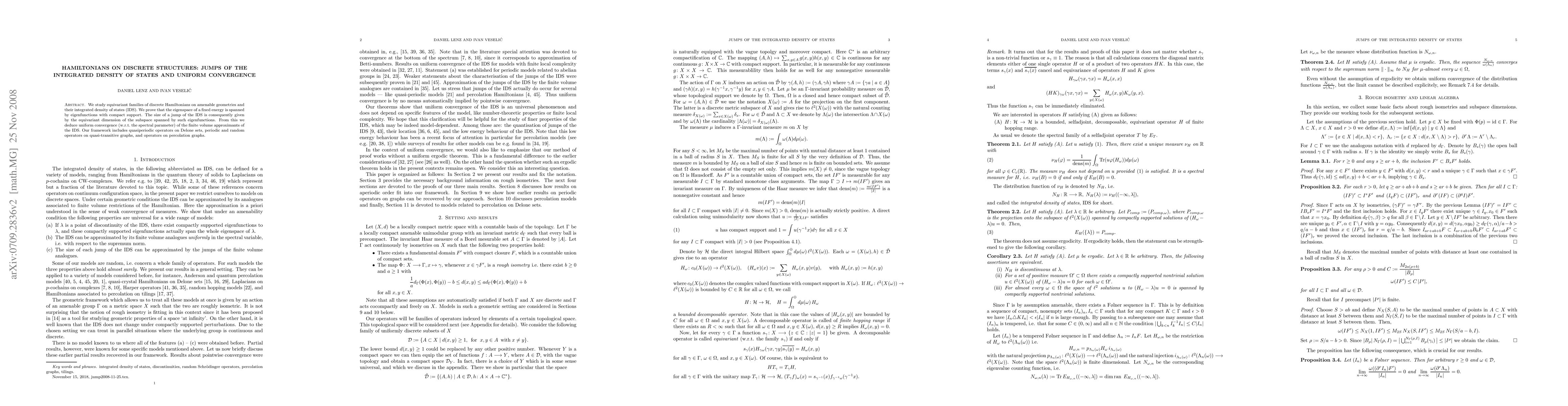 This paper investigates equivariant families of discrete Hamiltonians on amenable geometries, proving that jumps in the integrated density of states are determined by the equivariant dimension of eigenfunctions with compact support. It also demonstrates uniform convergence of finite volume approximants of the integrated density of states.
