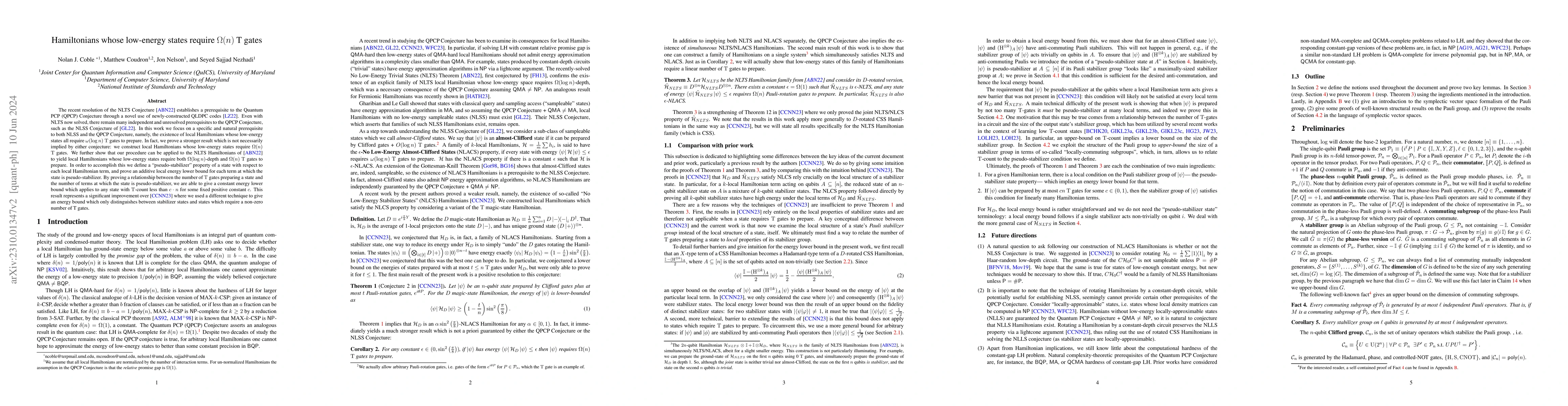 The recent resolution of the NLTS Conjecture [ABN22] establishes a prerequisite to the Quantum PCP (QPCP) Conjecture through a novel use of newly-constructed QLDPC codes [LZ22]. Even with NLTS now solved, there remain many independent and unresolved prerequisites to the QPCP Conjecture, such as the NLSS Conjecture of [GL22]. In this work we focus on a specific and natural prerequisite to both NLSS and the QPCP Conjecture, namely, the existence of local Hamiltonians whose low-energy states all require $\omega(\log n)$ T gates to prepare. In fact, we prove a stronger result which is not necessarily implied by either conjecture: we construct local Hamiltonians whose low-energy states require $\Omega(n)$ T gates. We further show that our procedure can be applied to the NLTS Hamiltonians of [ABN22] to yield local Hamiltonians whose low-energy states require both $\Omega(\log n)$-depth and $\Omega(n)$ T gates to prepare. In order to accomplish this we define a "pseudo-stabilizer" property of a state with respect to each local Hamiltonian term, and prove an additive local energy lower bound for each term at which the state is pseudo-stabilizer. By proving a relationship between the number of T gates preparing a state and the number of terms at which the state is pseudo-stabilizer, we are able to give a constant energy lower bound which applies to any state with T-count less than $c \cdot n$ for some fixed positive constant $c$. This result represents a significant improvement over [CCNN23] where we used a different technique to give an energy bound which only distinguishes between stabilizer states and states which require a non-zero number of T gates.