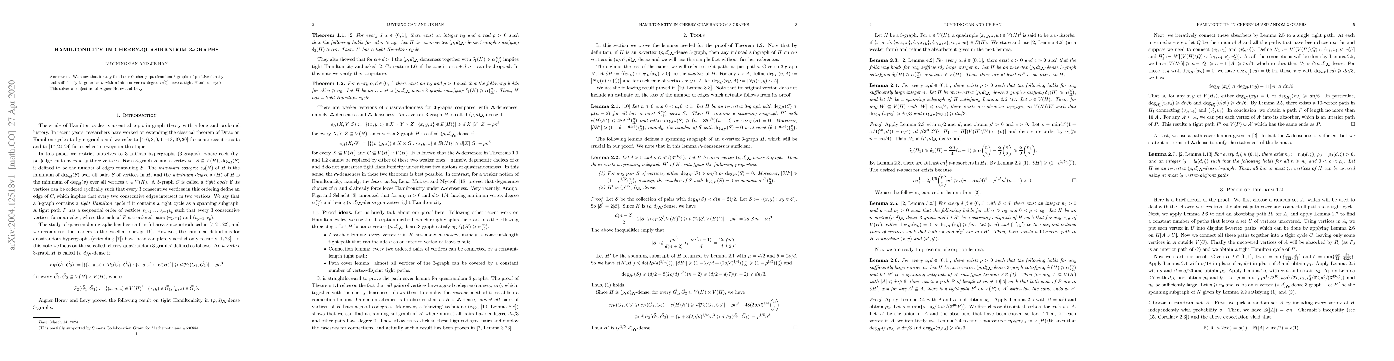 A research paper proves that a specific type of graph, called cherry-quasirandom 3-graphs, always contains a Hamilton cycle when its order is sufficiently large and vertex degree meets certain conditions. This resolves a long-standing conjecture in the field of graph theory.