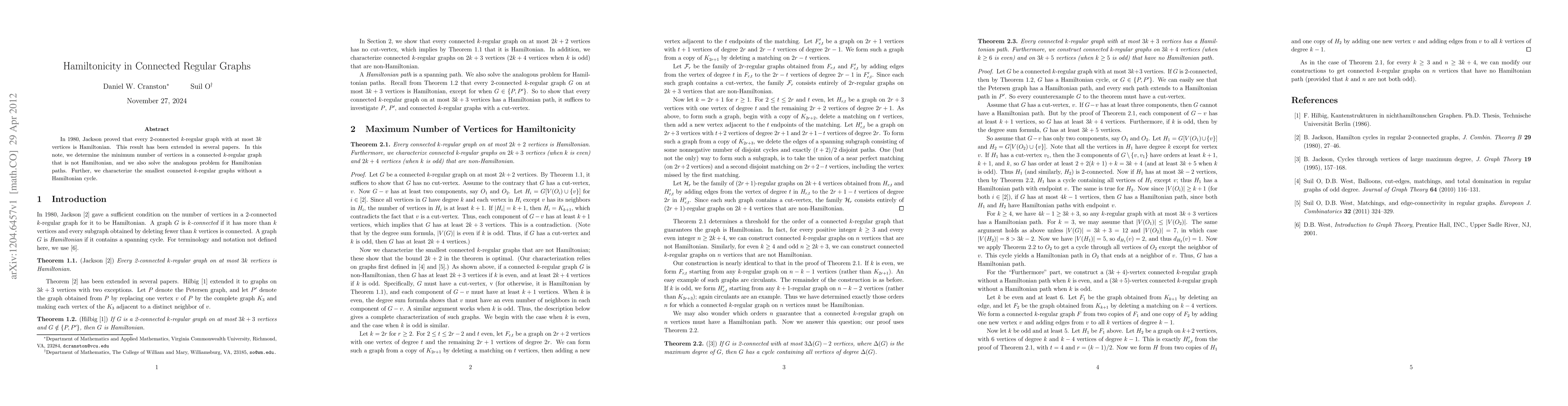 This paper extends Jackson's 1980 theorem on Hamiltonian cycles in 2-connected $k$-regular graphs, determining the minimum vertex count for non-Hamiltonian $k$-regular graphs and solving a similar problem for Hamiltonian paths. It also characterizes the smallest $k$-regular graphs lacking a Hamiltonian cycle.