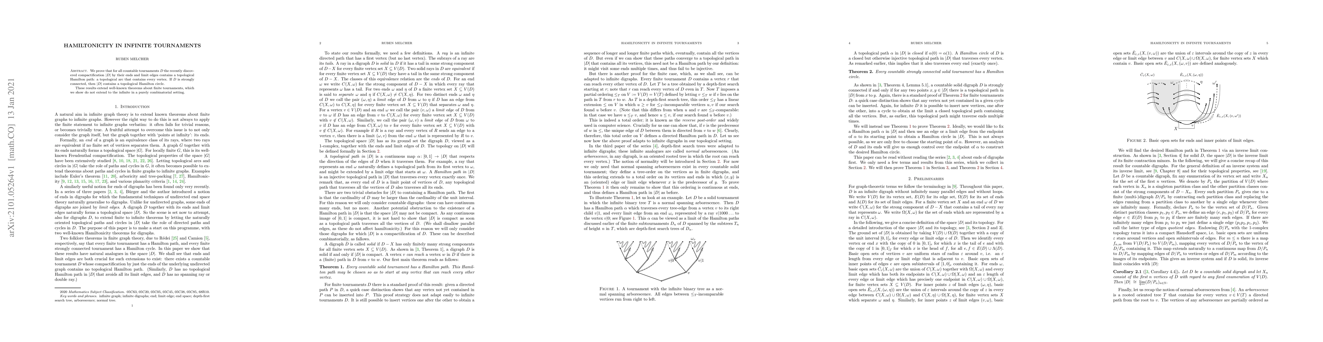 This work extends known theorems about finite tournaments to infinite ones by leveraging topological properties, providing a deeper understanding of Hamiltonicity in infinite structures.