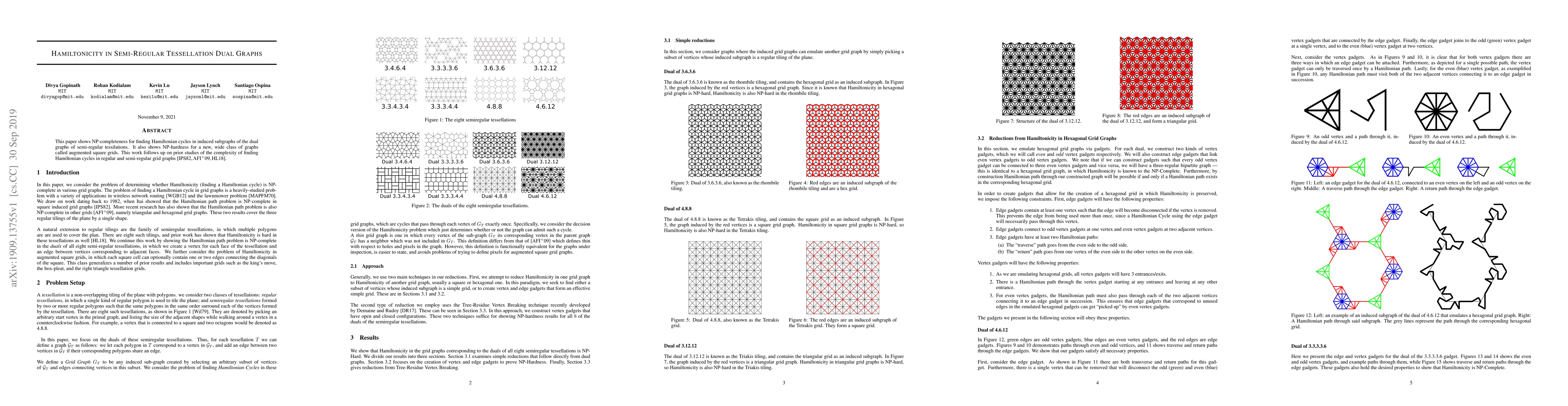 This paper shows NP-completeness for finding Hamiltonian cycles in induced subgraphs of the dual graphs of semi-regular tessilations. It also shows NP-hardness for a new, wide class of graphs called augmented square grids. This work follows up on prior studies of the complexity of finding Hamiltonian cycles in regular and semi-regular grid graphs.