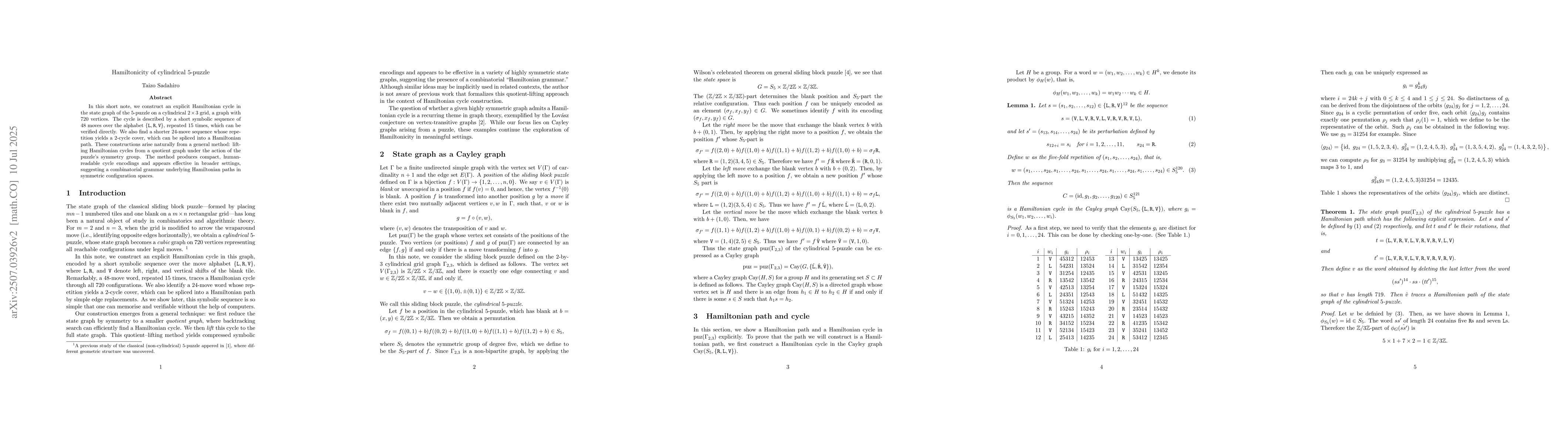 We construct an explicit Hamiltonian cycle in the state graph of the 5-puzzle on a toroidal 2x 3 grid, a graph with 720 vertices. The cycle is described by a short symbolic sequence of 48 moves over the alphabet {L,R,V}, repeated $15$ times, which can be verified directly. We also find a shorter 24-move sequence whose repetition yields a 2-cycle cover, which can be spliced into a Hamiltonian path. These constructions arise naturally from a general method: lifting Hamiltonian cycles from a quotient graph under the action of the puzzle's symmetry group. The method produces compact, human-readable cycle encodings and appears effective in broader settings, suggesting a combinatorial grammar underlying Hamiltonian paths in symmetric configuration spaces.