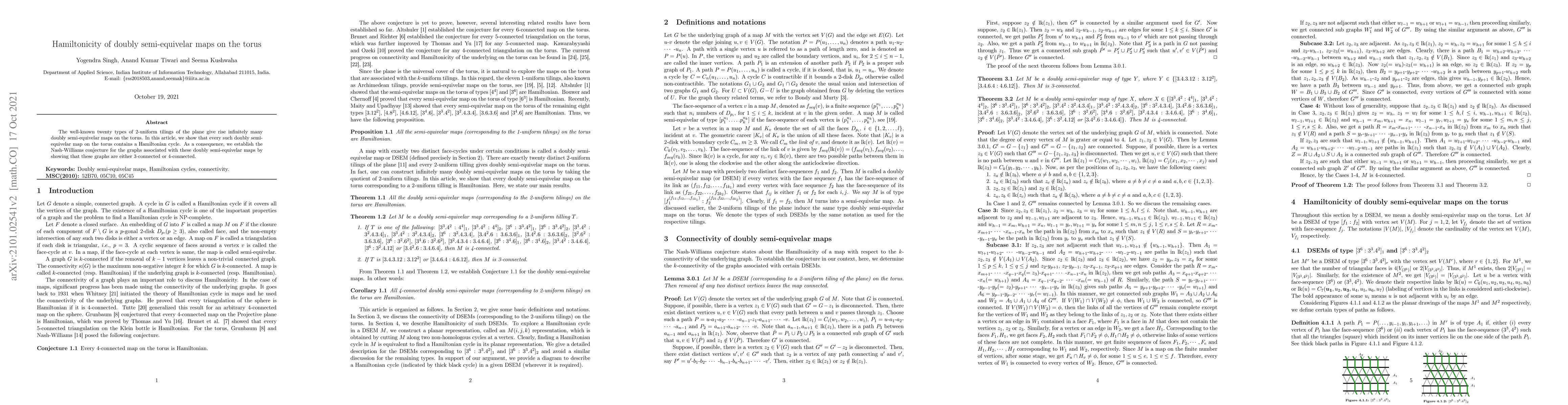 Summary: This research proves that every doubly semi-equivelar map on the torus, derived from 20 types of 2-uniform plane tilings, contains a Hamiltonian cycle. Consequently, it confirms the Nash-Williams conjecture for these maps' associated graphs, demonstrating their 3- or 4-connectivity.