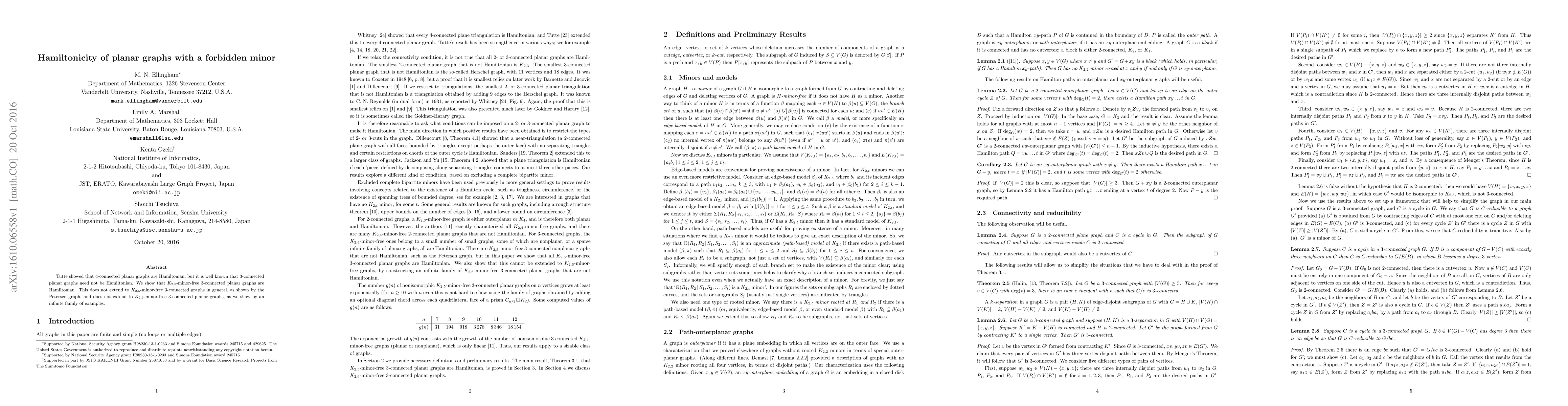 Summary: The paper proves that $K_{2,5}$-minor-free $3$-connected planar graphs are Hamiltonian, extending Tutte's result for $4$-connected planar graphs. However, the result does not hold for $K_{2,6}$-minor-free $3$-connected planar graphs or for $K_{2,5}$-minor-free $3$-connected graphs in general, as demonstrated by counterexamples.