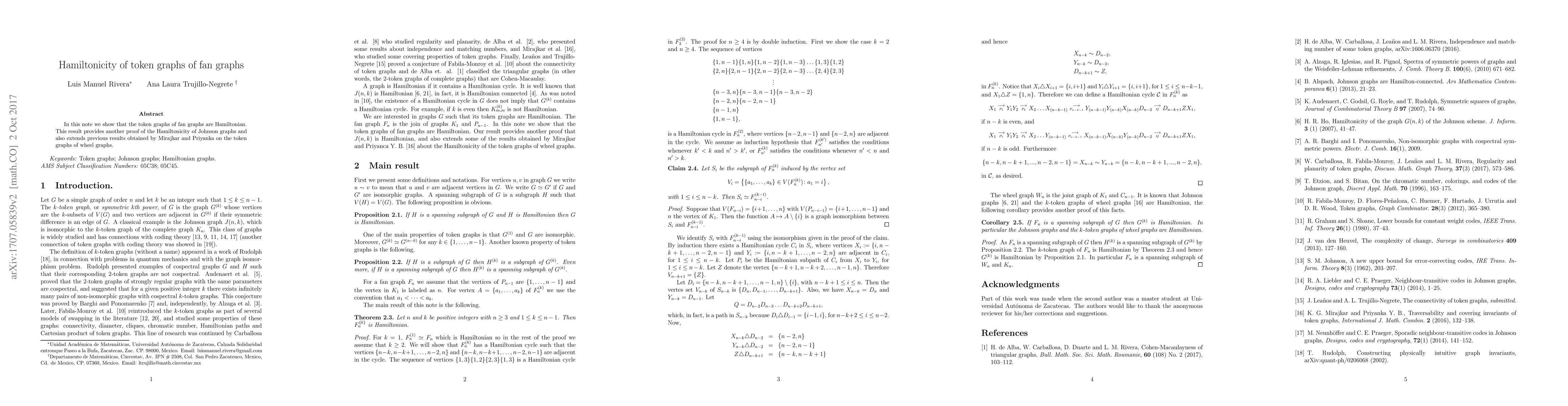 Summary: This paper demonstrates that token graphs derived from fan graphs are Hamiltonian, offering an alternative proof for the Hamiltonicity of Johnson graphs and expanding on earlier findings by Mirajkar and Priyanka Y. B.